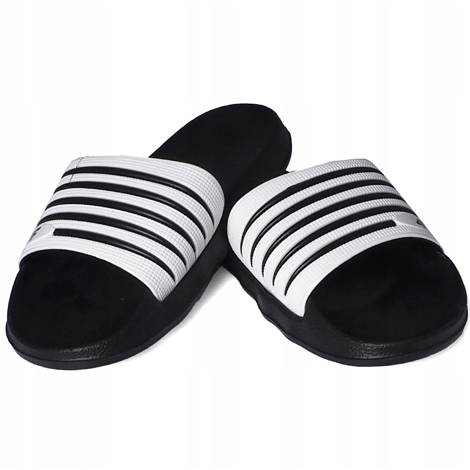 Klasične, ugodne ženske papuče 4F, savršene za ljeto - za šetnju, bazen ili plažu. Jednostavan, funkcionalan rez s kontrastnim prugama u crno -bijelim odgovara mnogim ljetnim stilizacijama.