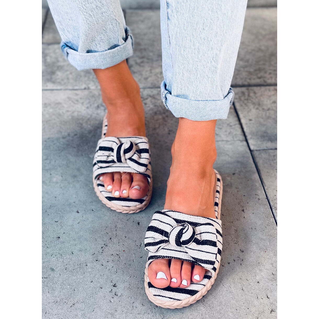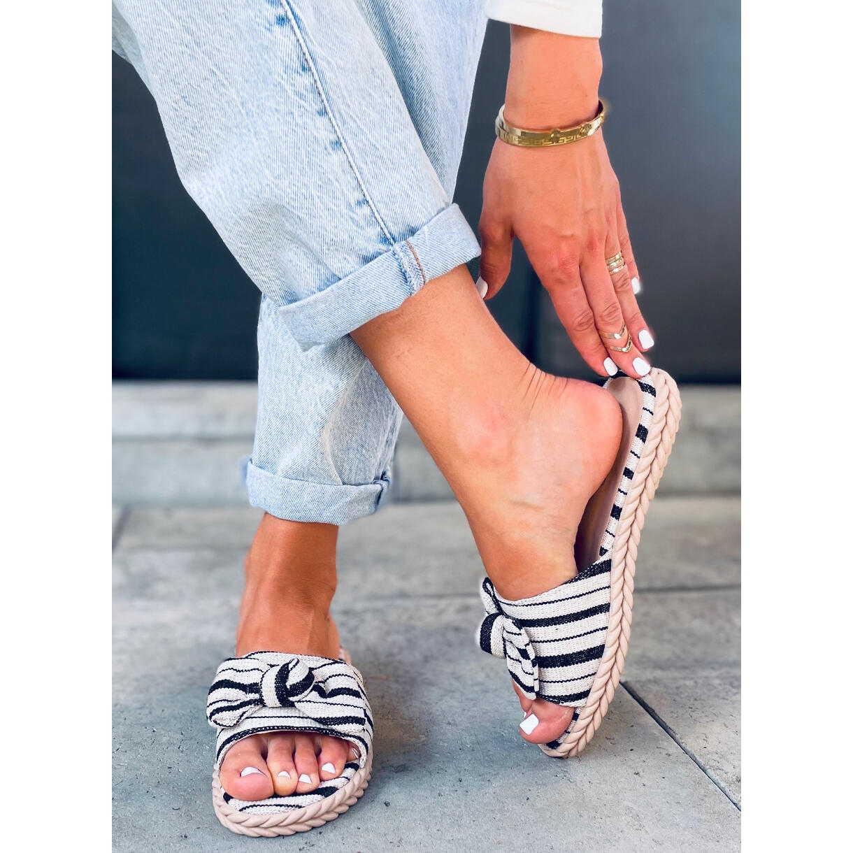 Predstavljamo vam Adana Black ženske papuče koje savršeno nadopunjuju vašu ljetnu garderobu. Ove moderne japanke s ravnim potplatom odlikuje se prekrasnom mašnom sprijeda i ljetnim prugastim uzorkom koji ih čini upečatljivima i daje šarm svakom stajlingu.