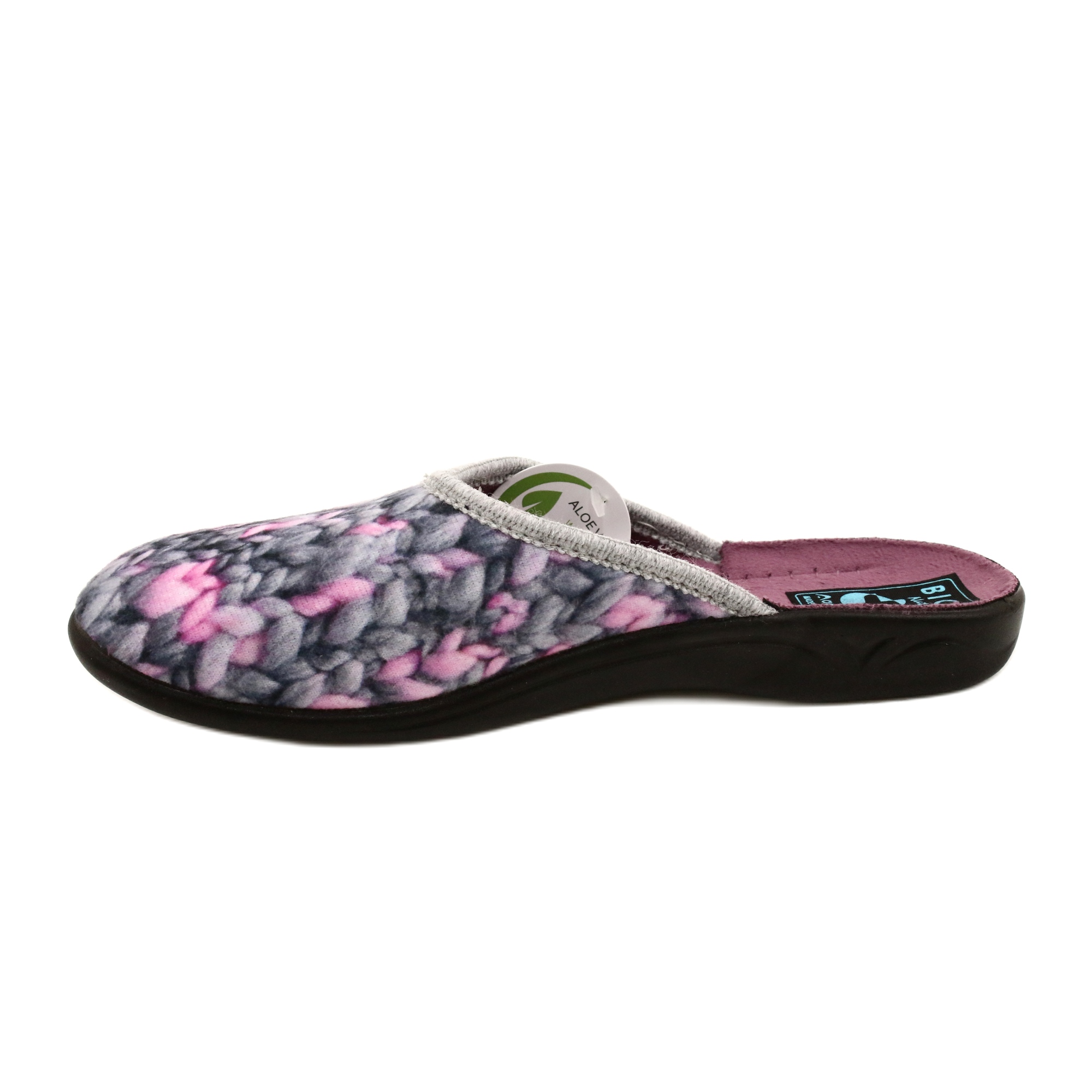 Udobne ženske papuče dizajnirane za osjetljiva stopala. Izrađen od mekog i fleksibilnog tekstilnog materijala, s ugodnom velurnom oblogom i umetom natopljenom u ekstraktu aloe vere (aloe vera), koji dodatno brine i osvježava kožu stopala.