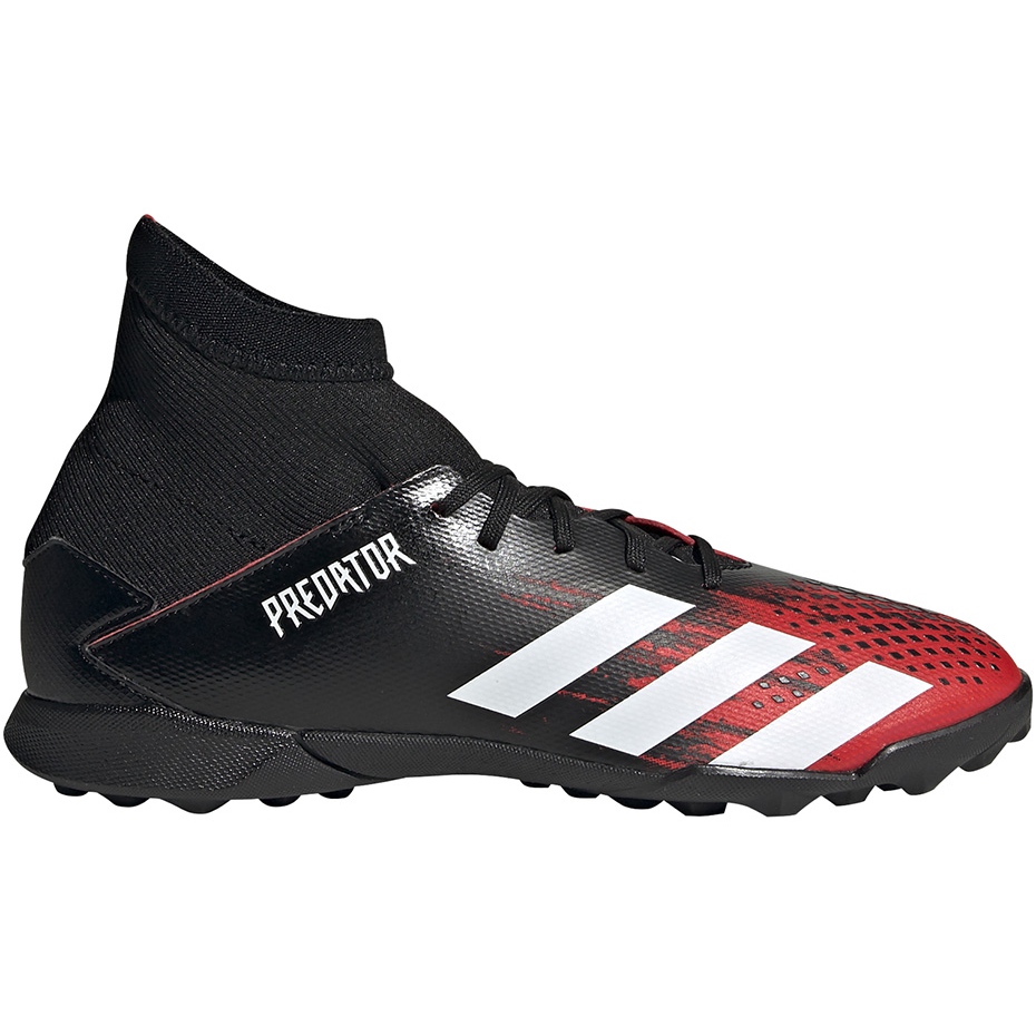 Adidas Predator 20.3 TF cipele namijenjene mladim igračima iz kolekcije mutator paketa kombiniraju dinamički dizajn s funkcionalnošću potrebnom tijekom igranja na umjetnoj travi. Crni gornji dio s crvenim naglascima izrađen od sintetike visoke kvalitete ima strukturu demonskosnog razmaka s utisnutim uzorkom koji poboljšava kontrolu nad loptom i daje više kontakta na pucanju ili prolazu.