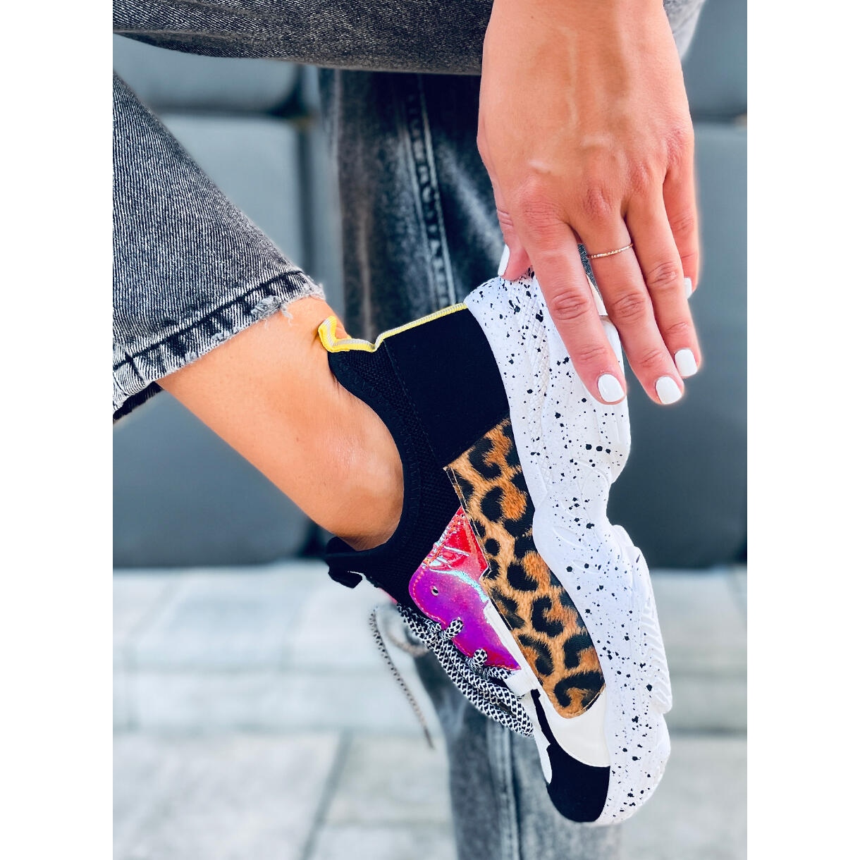 Detalji koji privlače pažnju su holografski umeci i hrabar motiv leoparda, koji cipelama daju jedinstven karakter. Savršene za svakodnevnu upotrebu, dobro će poslužiti iu urbanim stilovima i tijekom sportskih aktivnosti. Njihova ravna peta od 4 cm osigurava udobnost nošenja tijekom cijelog dana, a okrugli vrh dodaje lakoću.