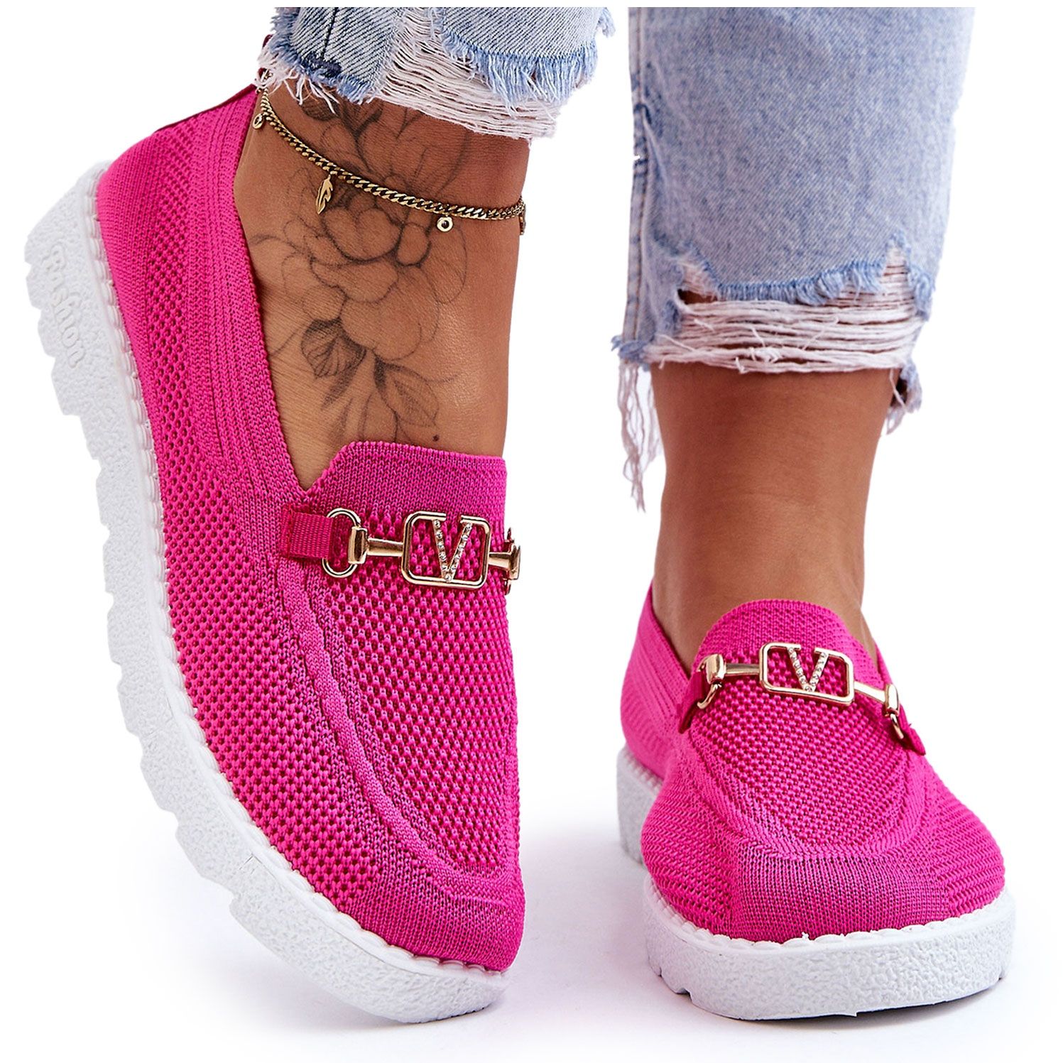 Moderne i udobne tenisice s klizanjem, koje će raditi svaki dan - za posao, kupovinu ili sastanak s prijateljima. Gornji ispred gležnja od meke tkanine u nijansi ružičaste (breskve/fuksia) ukrašene na prednjoj strani zlatnom nanošenjem s rhinestonesima koje imitiraju rinestone. Umetnuta struktura i ravna platforma osiguravaju udobnost i jednostavnost upotrebe.