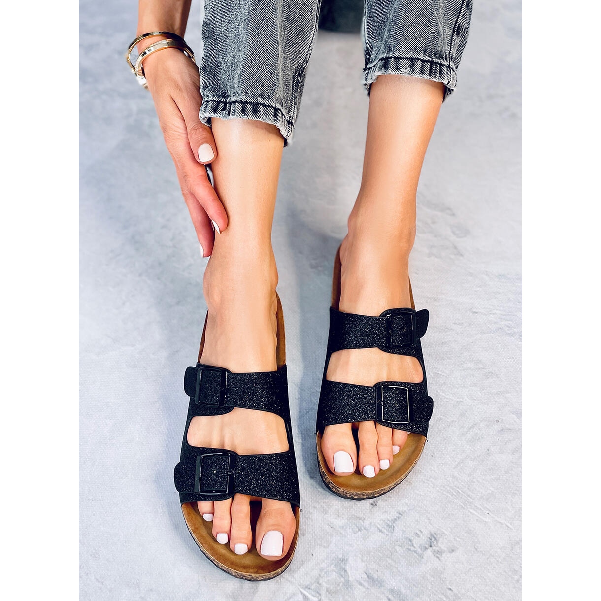 Alexa Black Glitter Flip Flops - Elegantni i udobni ženski flip flops koji će dodati sjaj u svakodnevne stilizacije. Crna, mat ekološka koža sa blistavim završetkom, profilirana umetak i podesive kopče garantiraju udobnost i savršeno uklapanje tijekom dana.