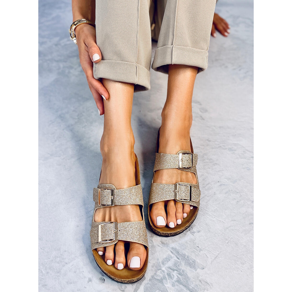 Pojedinosti: Alexa zlatne svjetlucave papuče od pluta zlatni