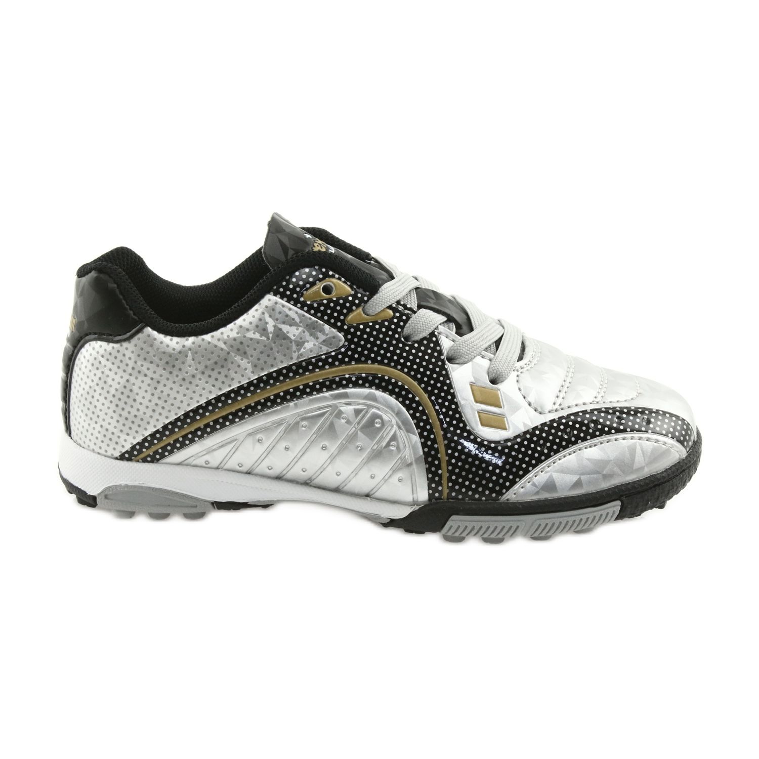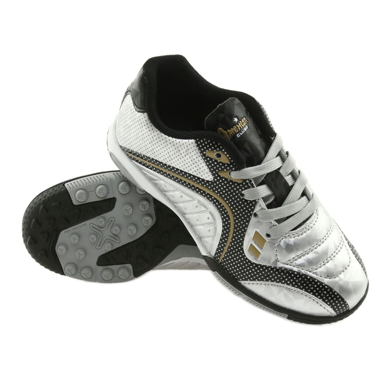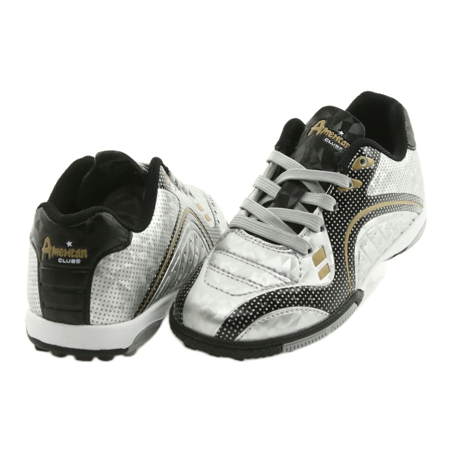 Turfy American Club OG29 su lagane i izdržljive cipele dizajnirane za igranje umjetničkog tona. Gornja izrađena od ekološke kože visokog kvaliteta osigurava imunitet i jednostavnost čišćenja, dok mekana tkanina i dodatna pjena jamči udobnost tijekom dugog treninga i podudaranja. Potplat s gazištem dizajniran je za maksimalno prianjanje orlova, a čvrsti šavovi i pažljivi završni sloj svjedoče o pouzdanosti američkog klupskog branda. Kopča na čipkama omogućuje vam da savršeno uskladite cipelu s stopalom. Model je dostupan u spektakularnoj srebrnoj boji s crnim aditivima; Također se pojavljuje u verzijama s elementima zlata.