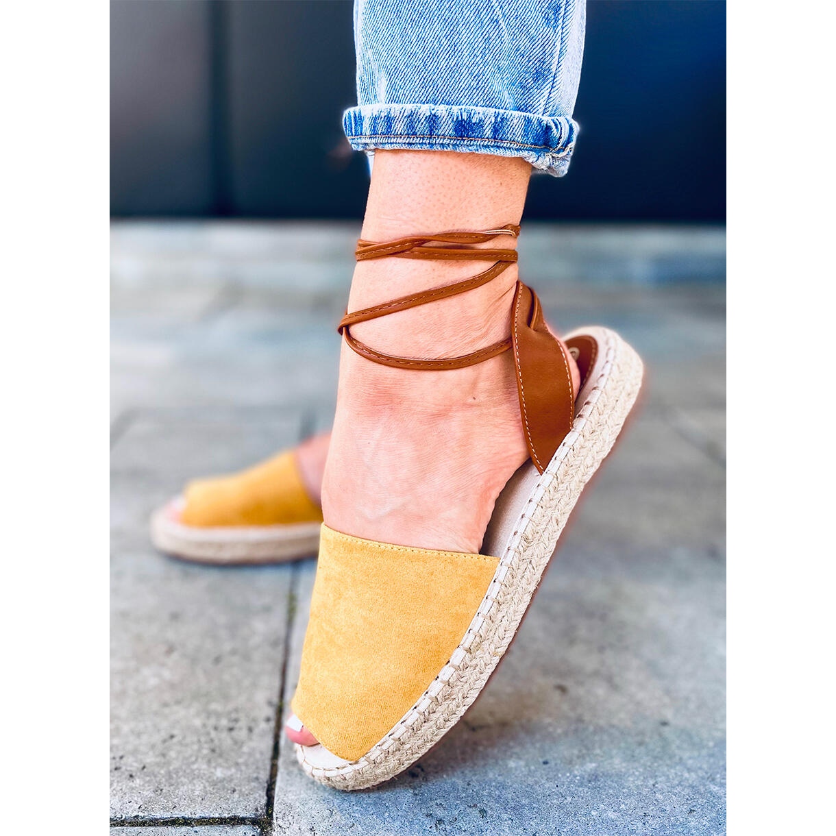 Potplat od pletene lanene niti visine 2,5 cm daje lakoću i naglašava ljetni karakter espadrila. Kontrastni modni dodaci harmonično se uklapaju u smeđu i žutu paletu boja, stvarajući moderan duo koji privlači pozornost.