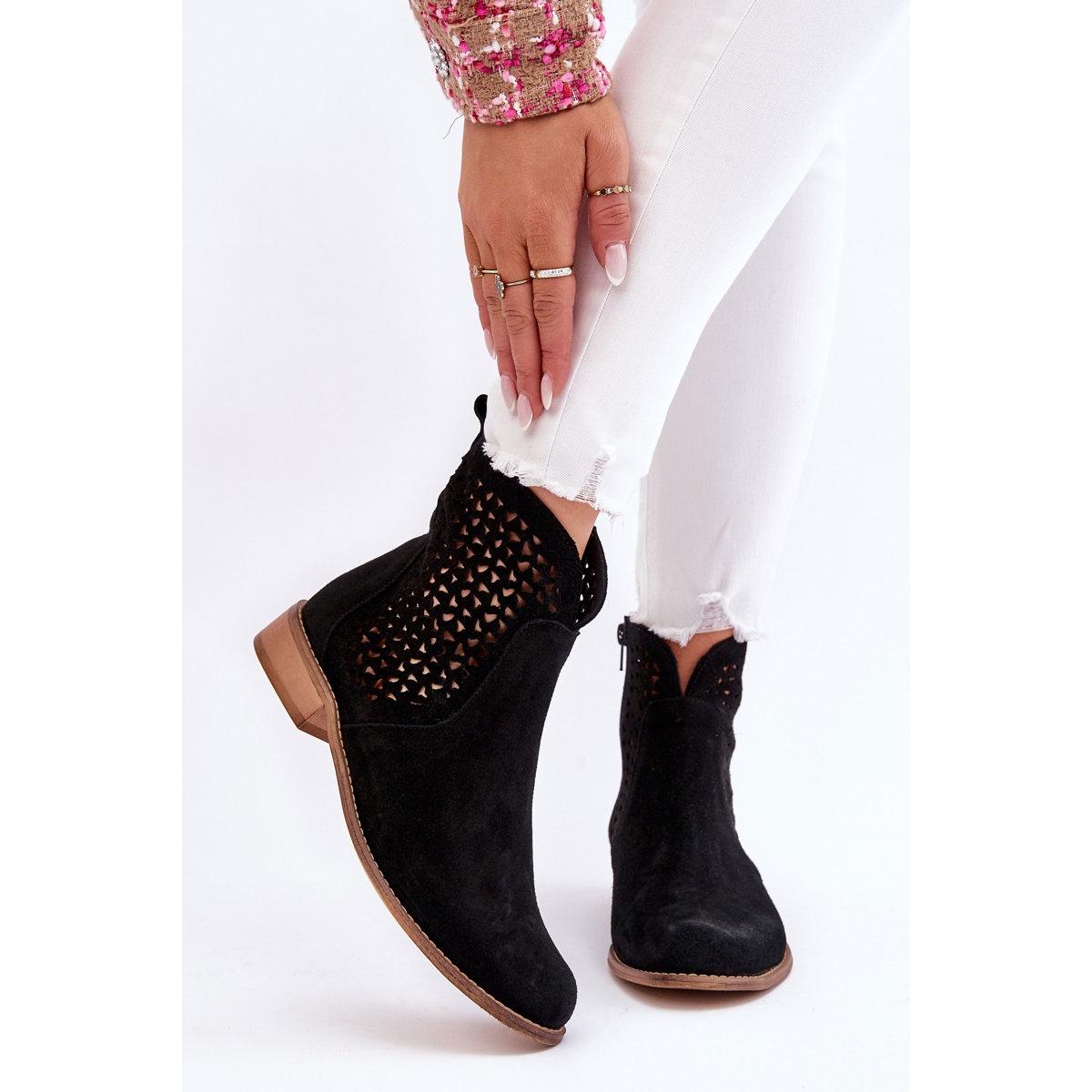 Suede čizme Nicole 2791/028 - elegantne, udobne i univerzalne, savršene na dnevnoj osnovi i za stilove stilova. Napravljen od prirodnog antilop u klasičnoj crnoj boji, s laganim ukrasom otvorenog rada, što im daje suptilnu lakoću. Klizač zašiljen sa strane olakšava stavljanje, a ravna peta (3 cm) osigurava utjehu cijeli dan. Umetak od prirodne kože povećava udobnost i prozračnost. Model posegne za gležnjem (gornja visina 14 cm) - odličan izbor za hlače, suknje i haljine.