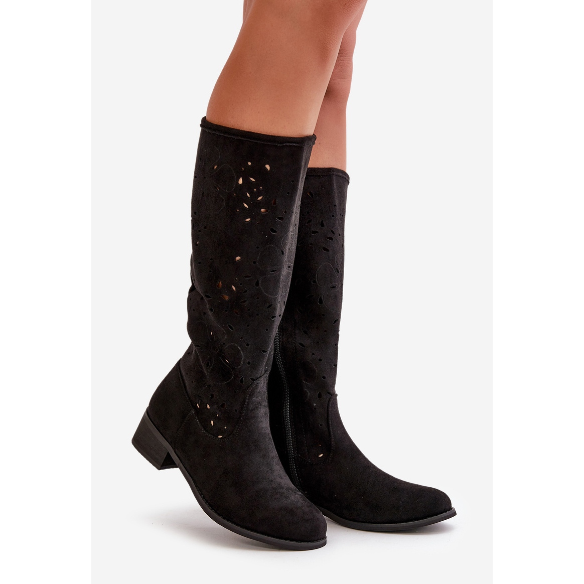 Ažurirane ženske čizme na nisku petu od eko antilop kože kopčaju se patentnim zatvaračem crne orhideje crna