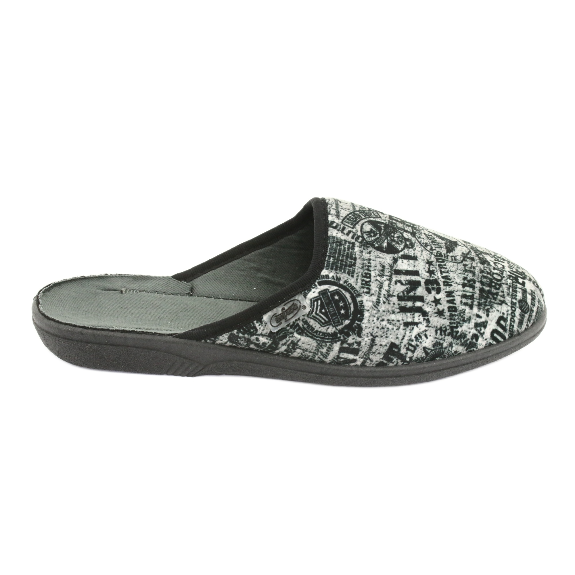Praktične, udobne kućne papuče iz Befada - Model 201Q091 u sivoj boji s otiscima. Slipped Flip jarud s ugrađenim nožnim prstima osigurajte kako biste zaštitili prste, a tvrdi potplat štiti stopala od hladnoće čak i na hladnim pločicama. Umetak od meke tkanine povećava udobnost upotrebe i pruža prozračnost.
