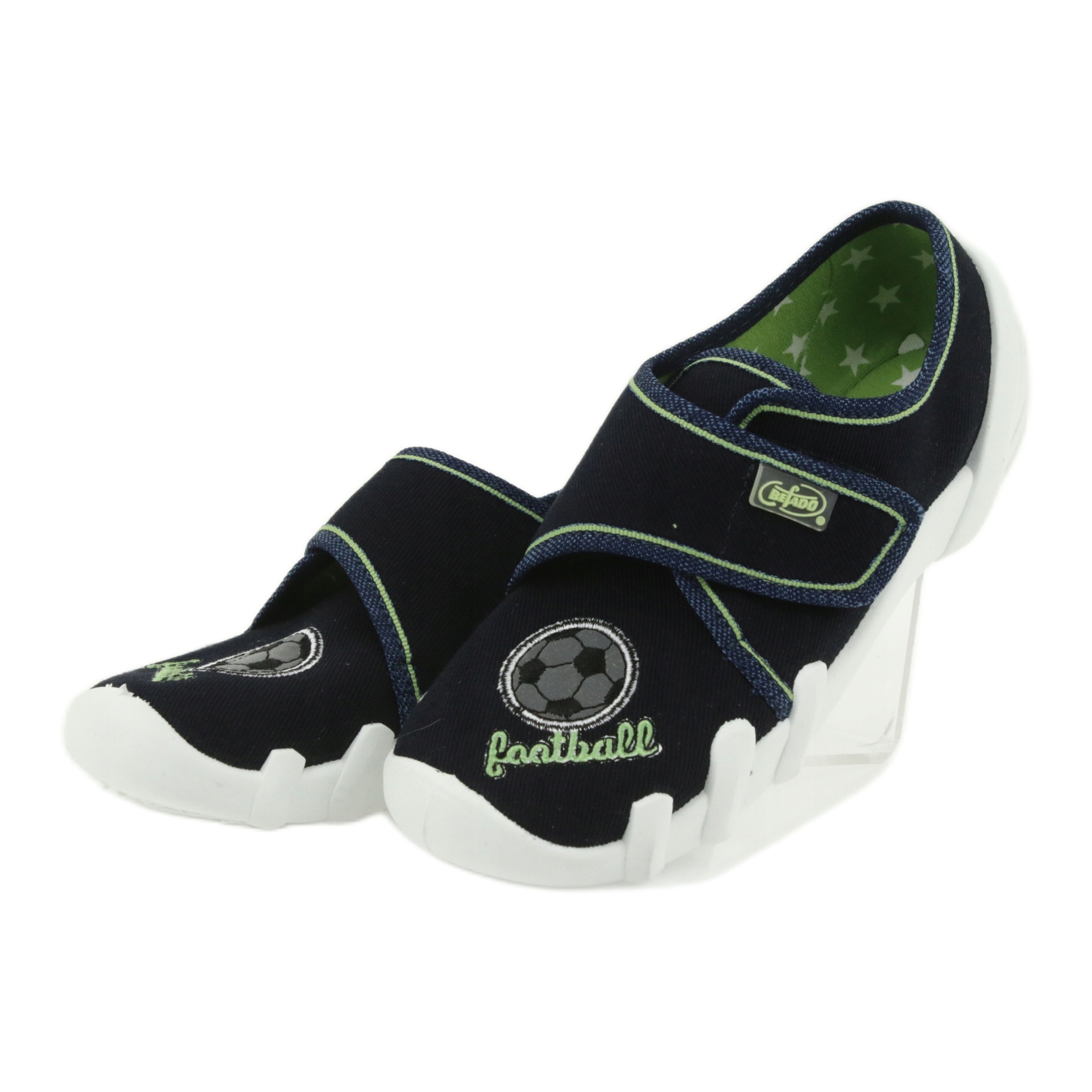 Dječje cipele Befado odlikuju se i estetskim dizajnom u mornarsko plavoj i zelenoj boji koji će se svidjeti mnogim dječacima. Dodatni elementi, poput krute potpetice i znaka "Zdravo stopalo", naglašavaju kvalitetu i funkcionalnost ovog modela.