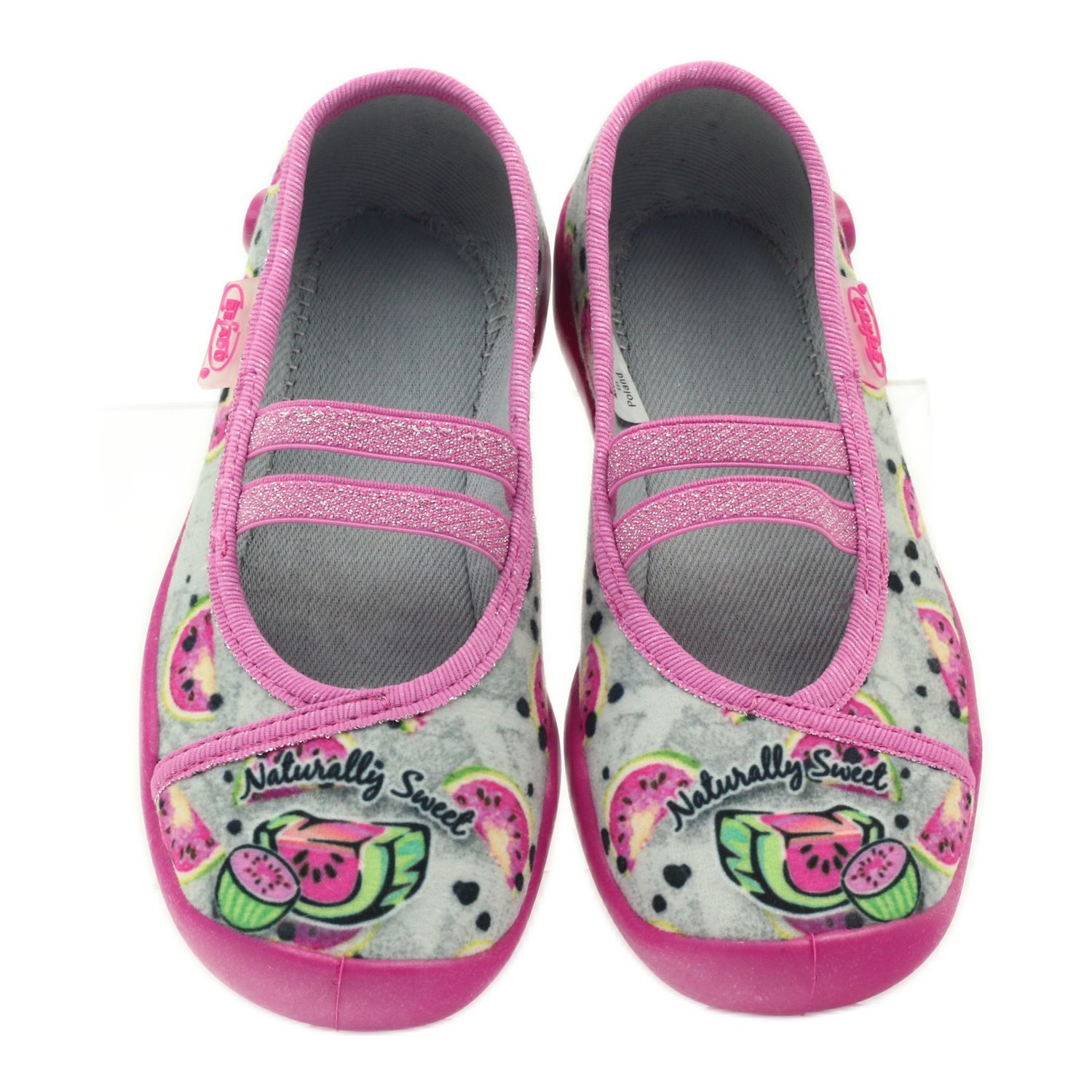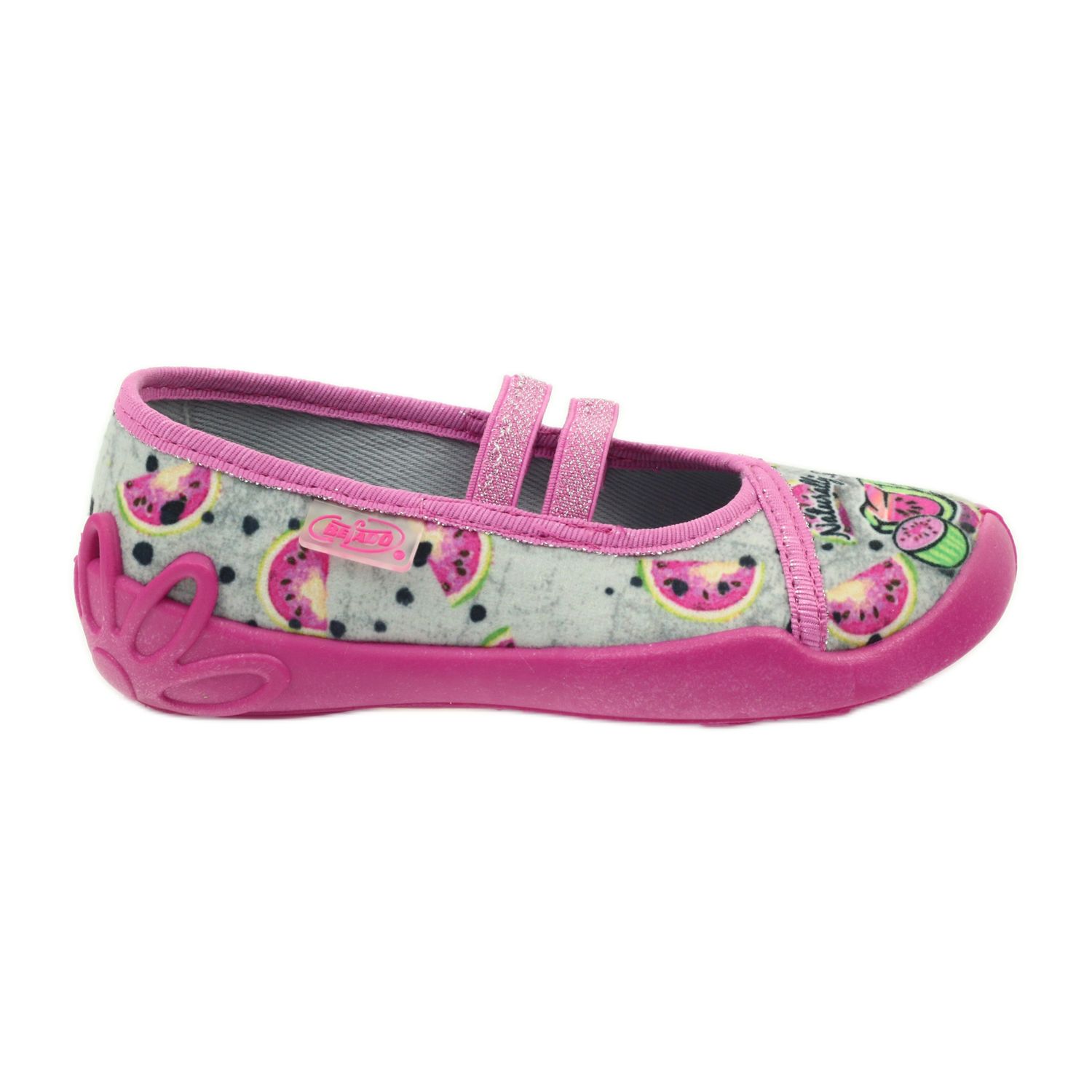 Ove balerinke odlikuje se ortopedski ispravnim potplatom s blago podignutim stranicama i višom potpeticom koja dodatno podupire stopala djevojčica u njihovim svakodnevnim avanturama. Cvjetni uzorak s lubenicama na sivoj pozadini daje im šarm, a dvije ukrasne gumice na vrhu čine papuče još upečatljivijim.