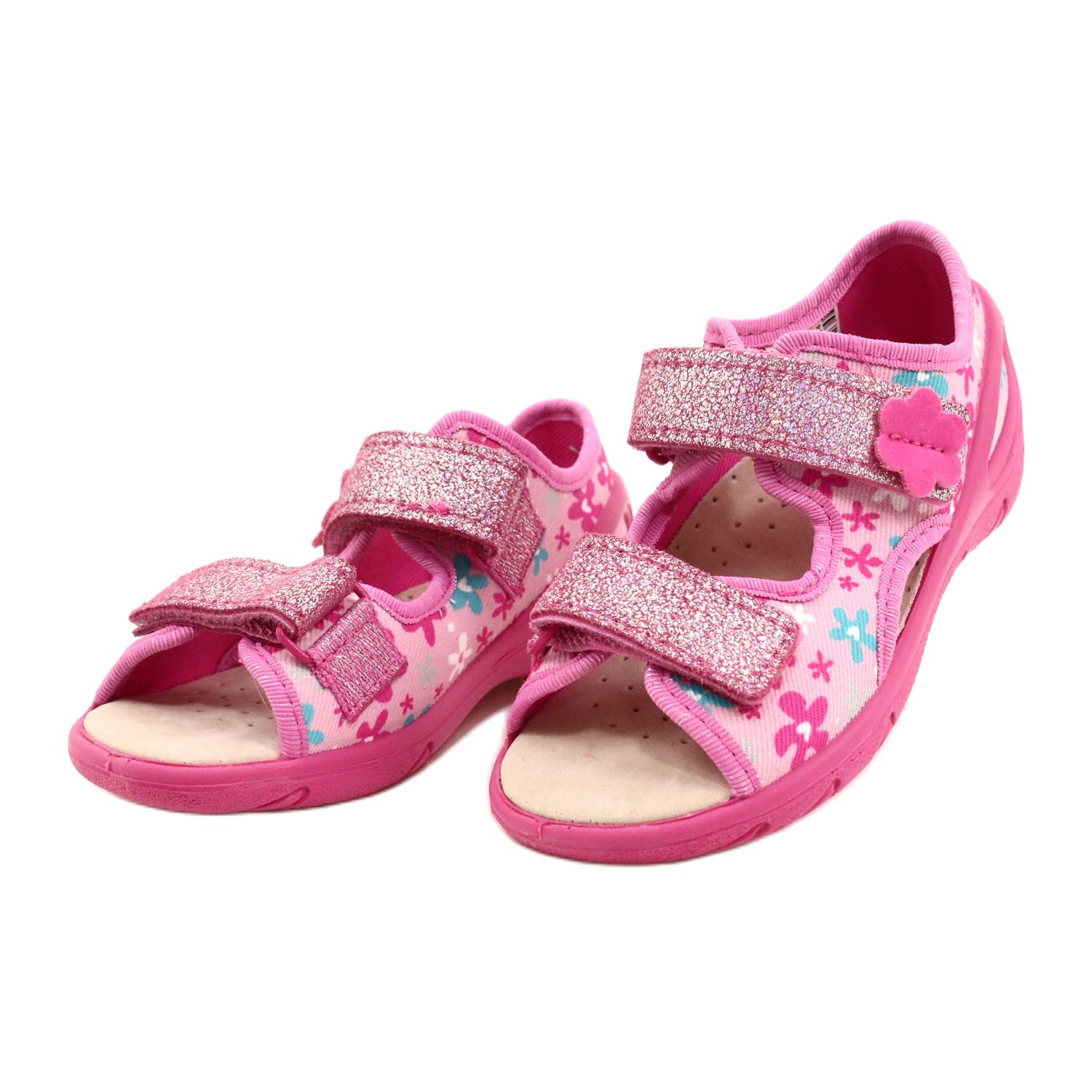 Ružičaste sandale Befado pu 065X178 savršen su izbor za svaku malu princezu. Dizajnirane su imajući na umu udobnost i zdravlje dječjih stopala, što potvrđuje i pozitivno mišljenje Instituta za industriju kože u Krakovu. Zahvaljujući gornjištu izrađenom od prozračnog pamuka i tkanine za obuću, dječjem stopalu bit će osigurana odgovarajuća ventilacija, što je posebno važno u toplijim danima.