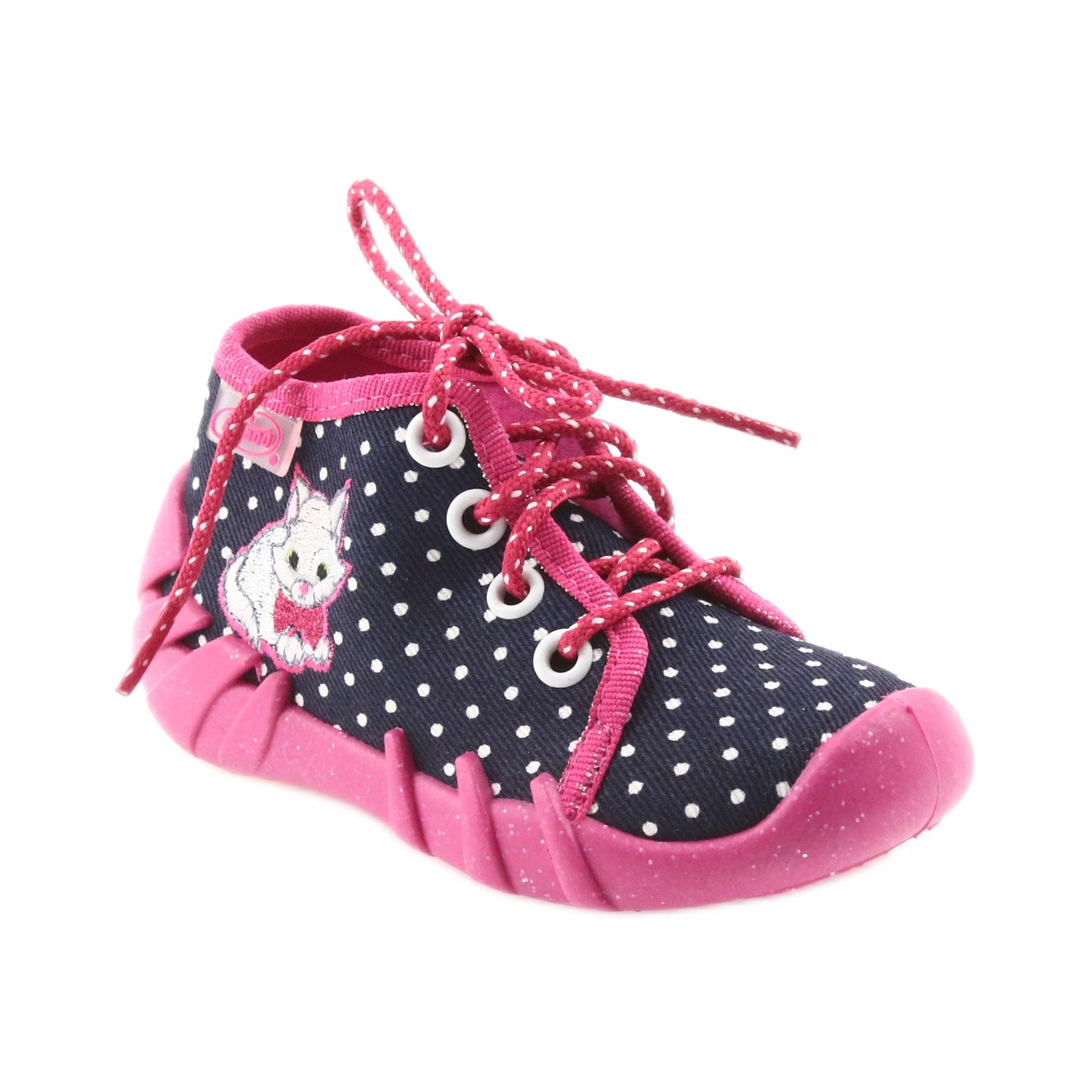 Ove preslatke cipele u bijeloj, ružičastoj i tamnoplavoj boji, ukrašene smiješnim točkicama i motivom mačića, spajaju moderan dizajn s funkcionalnošću. Izrađene od visokokvalitetne pamučne tkanine, osiguravaju odgovarajuću ventilaciju koja je ključna za zdravlje djetetovih stopala. Zahvaljujući upotrebi prozračnog materijala u potplatu, papuče održavaju higijenu i udobnost tijekom nošenja, čak i dulje vrijeme.