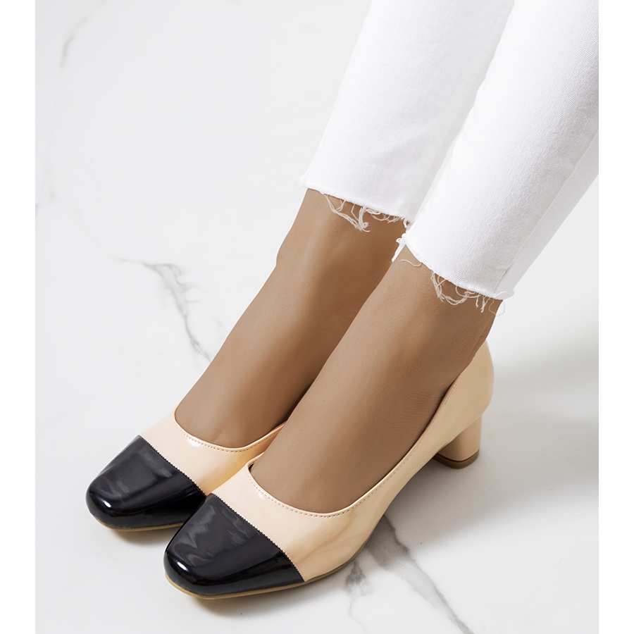 Model je opremljen originalnim, ovalnim stupom visine 4,5 cm, koji osigurava stabilnost i udobnost tijekom cijelog dana. Četvrtasti vrh daje im moderan karakter, a lakirana završna obrada privlači pažnju i savršeno se uklapa u trendove. Bež boja s crnim detaljima pristaje mnogim stilovima, kako ležernim tako i elegantnijim.