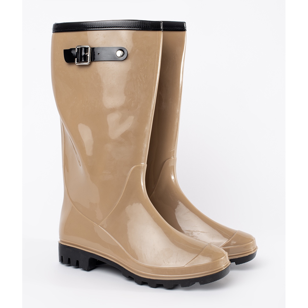 Evo bež lakiranih ženskih kišnih čizama, koje su savršeno rješenje za kišne dane. Napravljeni od visokokvalitetne gume, oni pružaju izvrsnu otpornost na vodu, a njihov stilski, ležerni dizajn čini ih savršeno kombiniranim i svakodnevnim i elegantnijim stilizacijama.