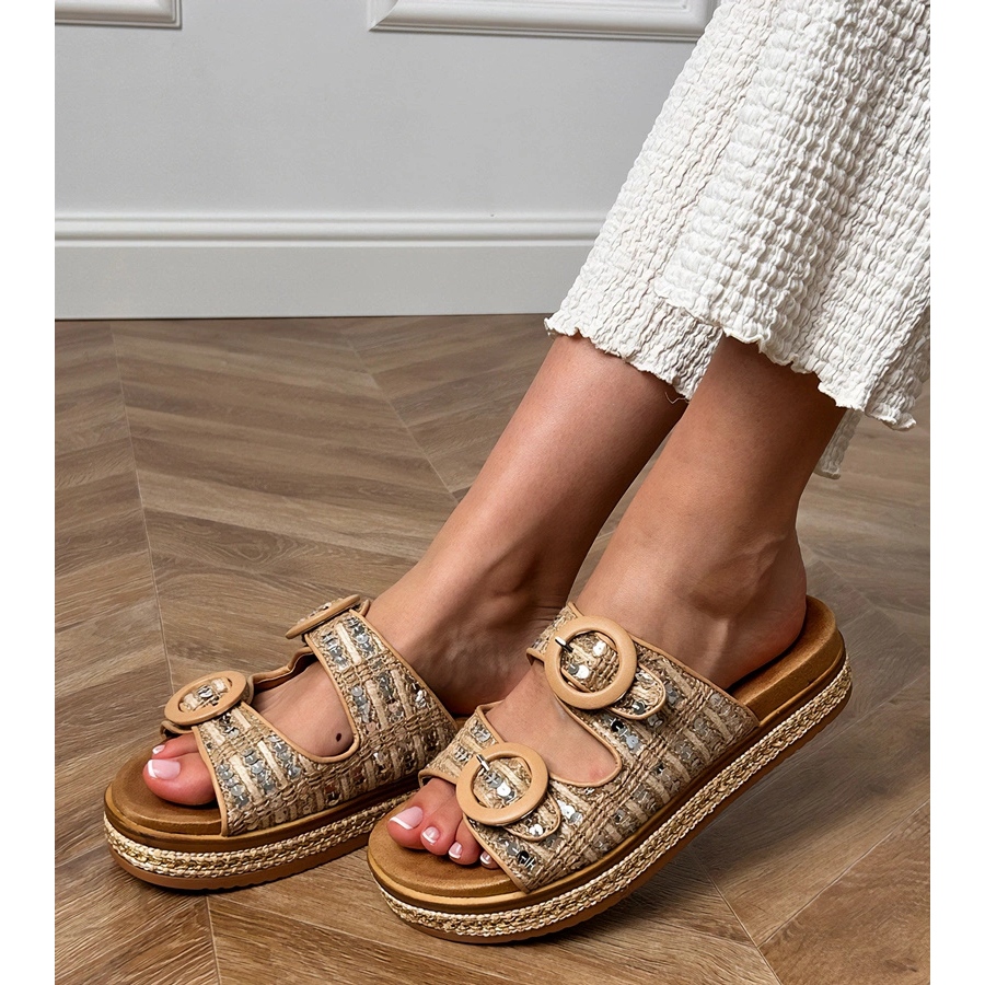 Beige pleteni jastuci sa šljokicama nužni su u svakom ljetnom garderobi. Savršeni svaki dan, oni kombiniraju eleganciju s ležernim stilom, istovremeno pružajući udobnost. Izrađene od visokokvalitetnog sintetičkog materijala, oni su izdržljivi i jednostavni za njegu, što ih čini savršenim izborom u toplim danima.