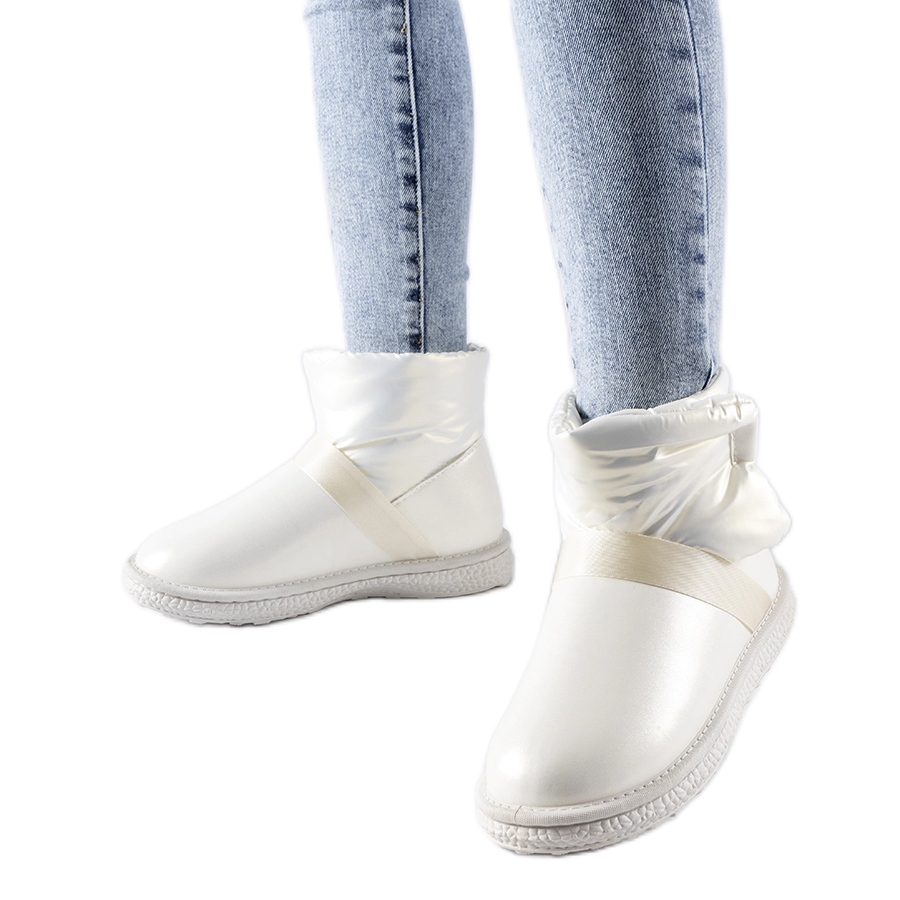 Moderne, kratke snježne čizme u univerzalnoj bež boje s nježnim sjajem, koji će biti savršeni i za svakodnevne i za elegantne zimske stilizacije. Zahvaljujući platformi (3 cm) i gumenom potplatu, dobivate stabilnost i dodatnu izolaciju s hladnih površina. Zagrijavanje i vanjski materijal izrađen od ekološke kože osigurava toplinsku udobnost, a praktični čičak pričvršćivač olakšava stavljanje i stavljanje cipela u stopalo.