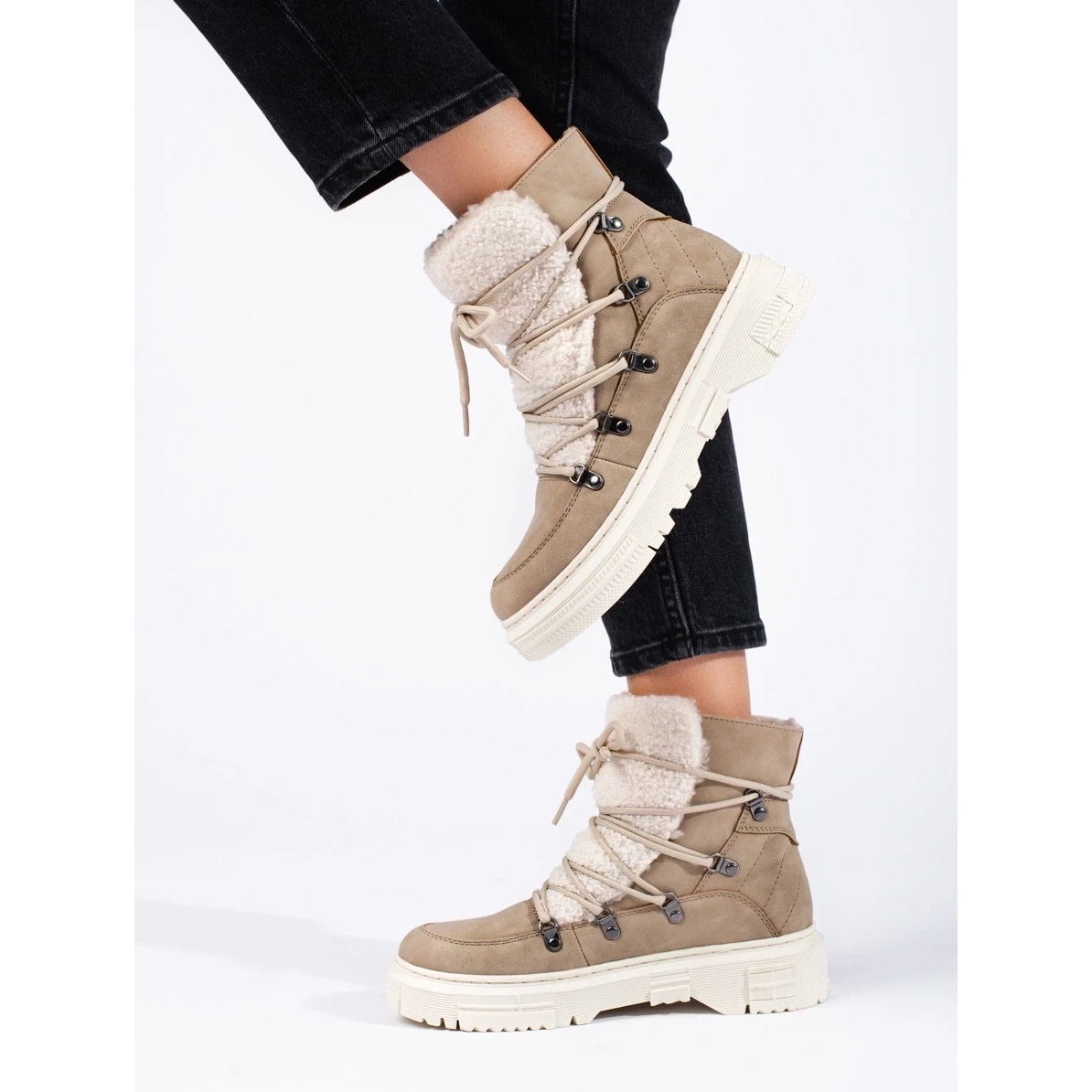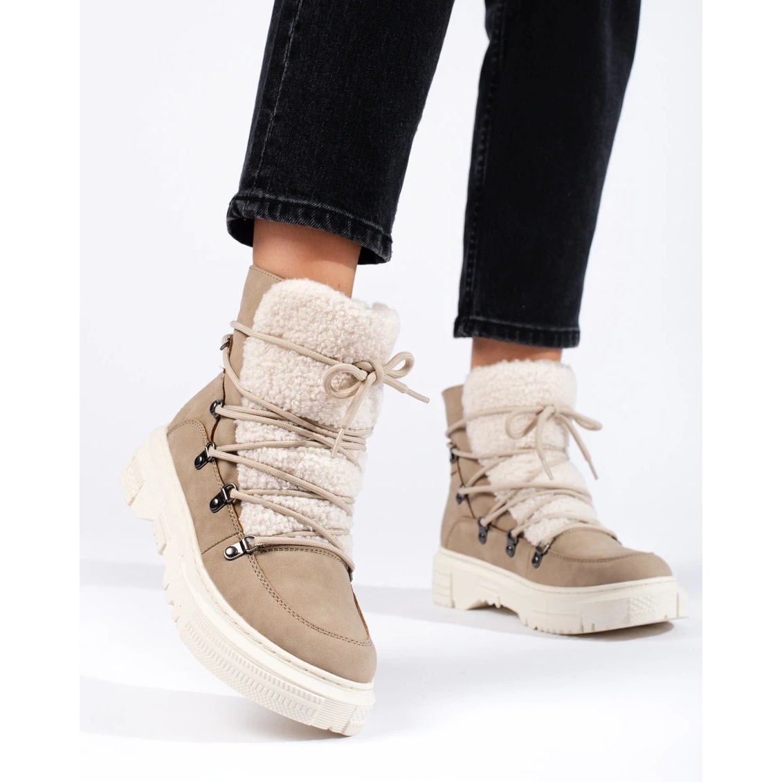 Bež snježne čizme s kaputom od ovčjeg kože kombiniraju udobnost i moderan izgled. Mekani, izolirani unutrašnjost i tekstil jamči toplinu i udobnost na niskim temperaturama. Gornji dio ekološke kože lako je održavati i otporan na prljavštinu, a ugrađeni -učvršćeni fester stabilizira stopalo dok hoda. Čipka -Up vam omogućuje prilagođavanje širine gornjeg dijela vaših potreba. Čvrsti potplat s čistim gazom poboljšava prianjanje na skliskim površinama.