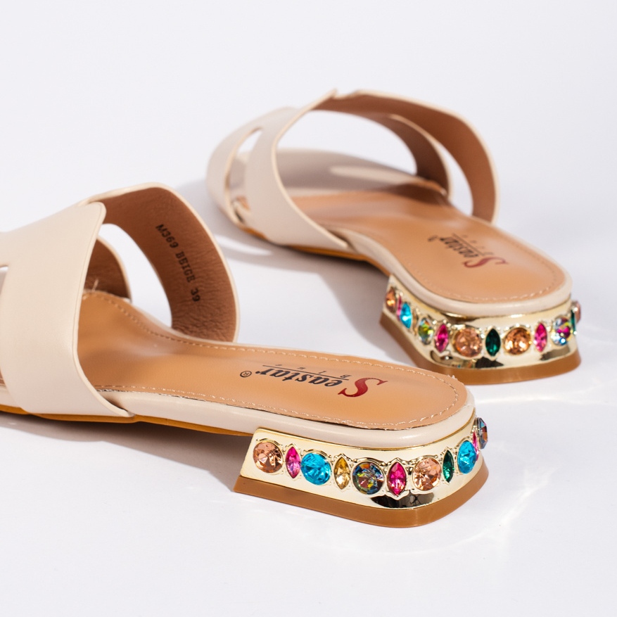Ovaj model karakterizira klizni pričvršćivač i otvorena peta, što ih brzo i jednostavno uklanjanje i uklanjanje. Glatki potplat od izdržljive plastike osigurava stabilnost i udobnost prilikom hodanja. Osim toga, suptilni rhinestones daju zaklopima elegantan naglasak, čineći ih savršeno spajajući i s dnevnim stilizacijama i elegantnijim odijelima.