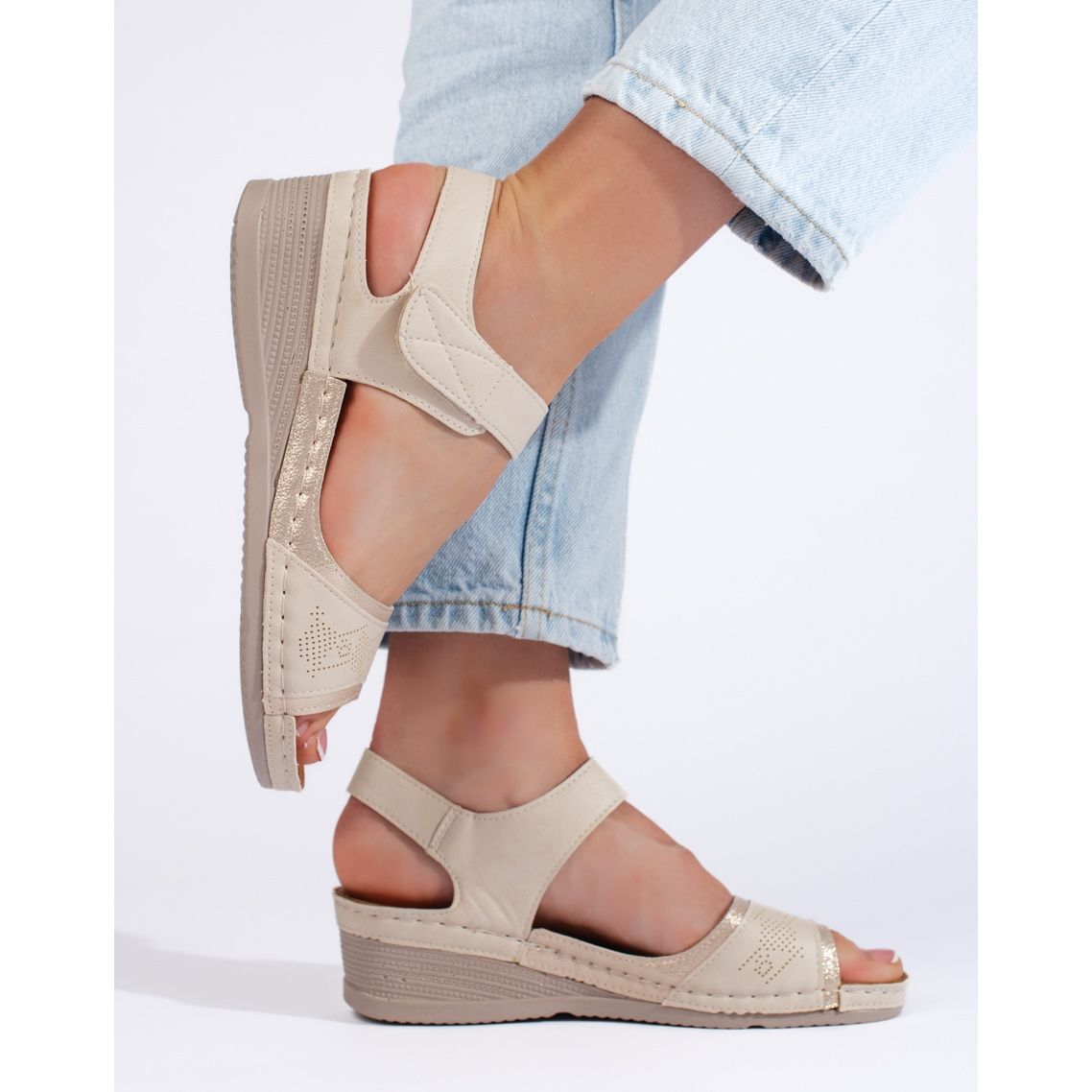 Peta u obliku visoke platforme od 4 cm dodaje i stil i optički produžava noge. Velcro sandale savršena su kombinacija funkcionalnosti i modernog dizajna, što olakšava stavljanje i uklanjanje obuće. Osim toga, zlatni naglasci suptilni su dodatak cjelini, što sandalama daje jedinstveni karakter.