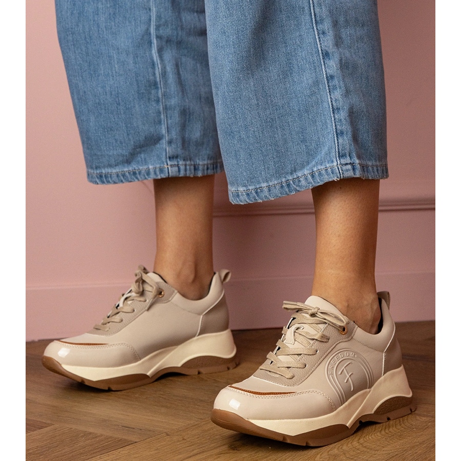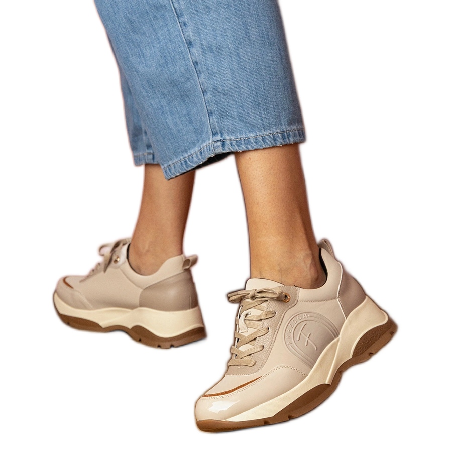 Bež boja cipela u kombinaciji s smeđim gumenim potplatom čini tenisice univerzalnim i lako se prilagođavaju bilo kojem garderobi. Lakirani završetak daje im stil, čineći ih savršenim izborom svakodnevno za aktivne žene koje se ne odustaju od modnog izgleda.
