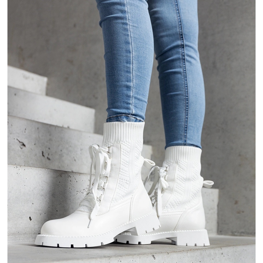 Delikatne, bijele čizme čarapa s trijemom prijedlog su za žene koje cijene kombinaciju modernog izgleda s udobnošću nošenja. Otvoreni gornji dio ekološke kože daje cipelama lagan, ljetni jesen karakter, a rez, kocka naglašava lik. Model je idealan za urbane stililizacije - od haljina i suknji do traperica.