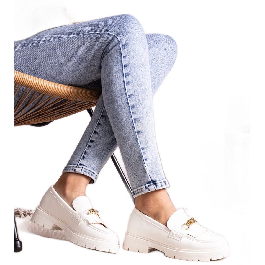 Bijeli natičnici s rubovima i zlatnim lancem savršeni su dodatak i svakodnevnim i elegantnijim stilizacijama. Bez obzira na priliku, ove će cipele sigurno privući oči i dati vam odjeću malo stila.
