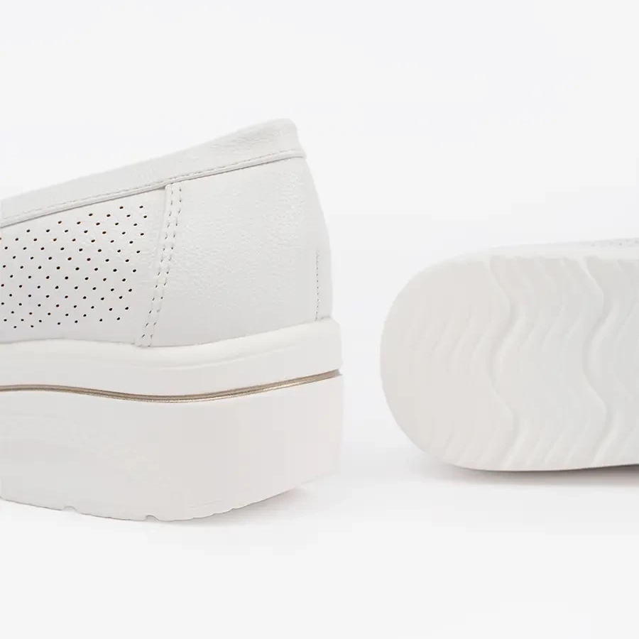 Mokasini opremljeni visokom platformom od 4,5 cm dodaju suptilan rast, a njihov stabilni potplat radit će na bilo kojoj površini. Pojedinosti o otvorenom razlikovanju ovog modela, dajući mu lakoću i svježinu. Zahvaljujući njihovoj univerzalnosti, bijeli natičnici iz Goodina savršeno se miješaju s ležernim i elegantnim stilizacijama, postajući neodvojivi element svake garderobe.