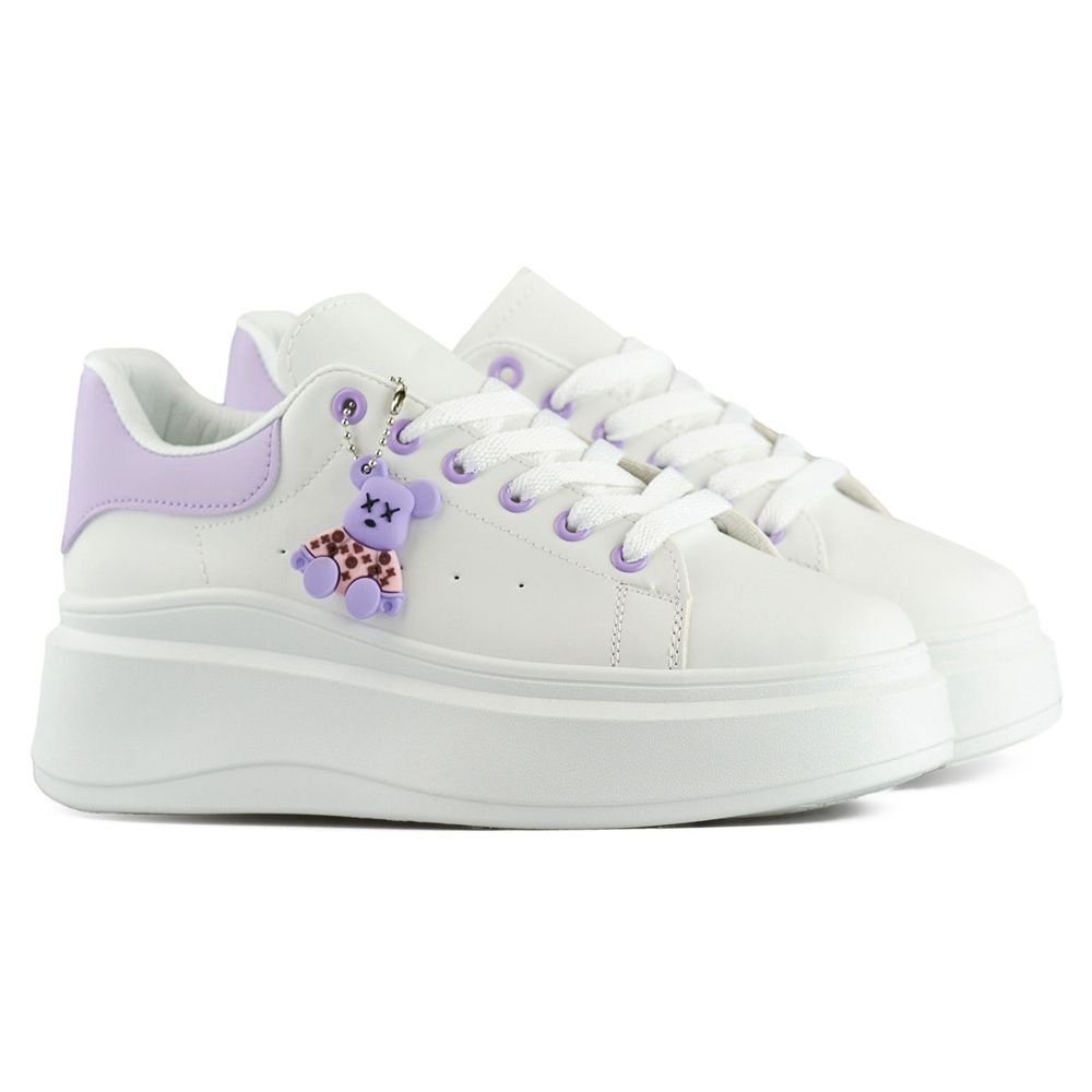 Detalji: Bijele sportske cipele s debelim potplatom i ljubičastim medvjedićem bijela