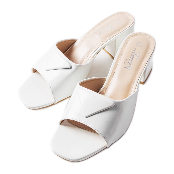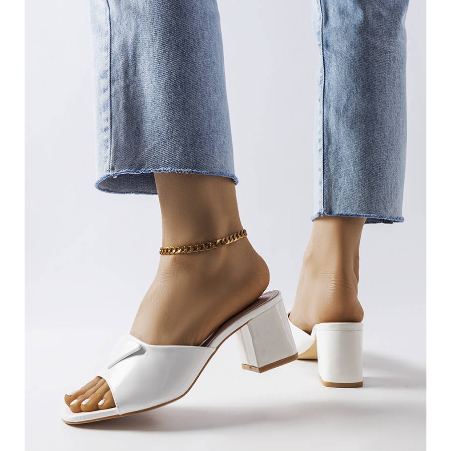 Upoznajte bijele lakirane Branch mule cipele s visokom potpeticom - must have svake moderne žene koja traži eleganciju i udobnost za ljetne dane. Ove elegantne japanke spoj su modernog dizajna i funkcionalnosti. Izrađene od ekološke kože, prekrivene upečatljivim lakom, privlače pozornost i daju svježinu svakom stajlingu.