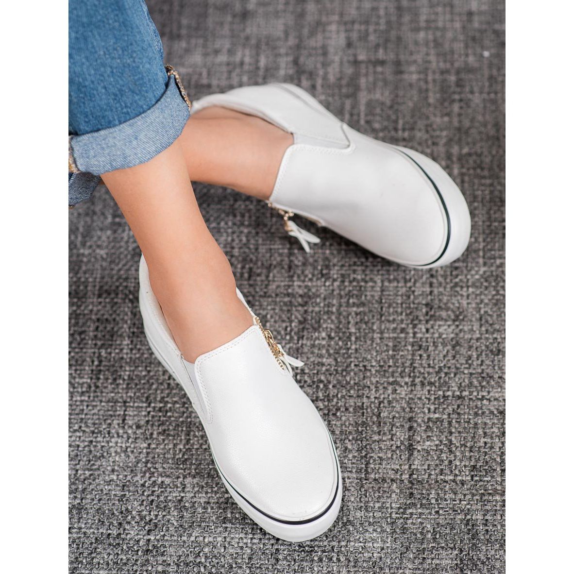 Otkrijte neusporedivu udobnost i stil s bijelim natikačama s patentnim zatvaračem iz SHELOVET-a. Ove iznimno moderne ženske tenisice minimalističkog dizajna savršeno će pristajati svakom svakodnevnom stajlingu. Njihov elegantan izgled naglašen je zlatnim patentnim zatvaračima smještenim na vanjskoj strani gornjišta, koji stilu dodaju moderan karakter.