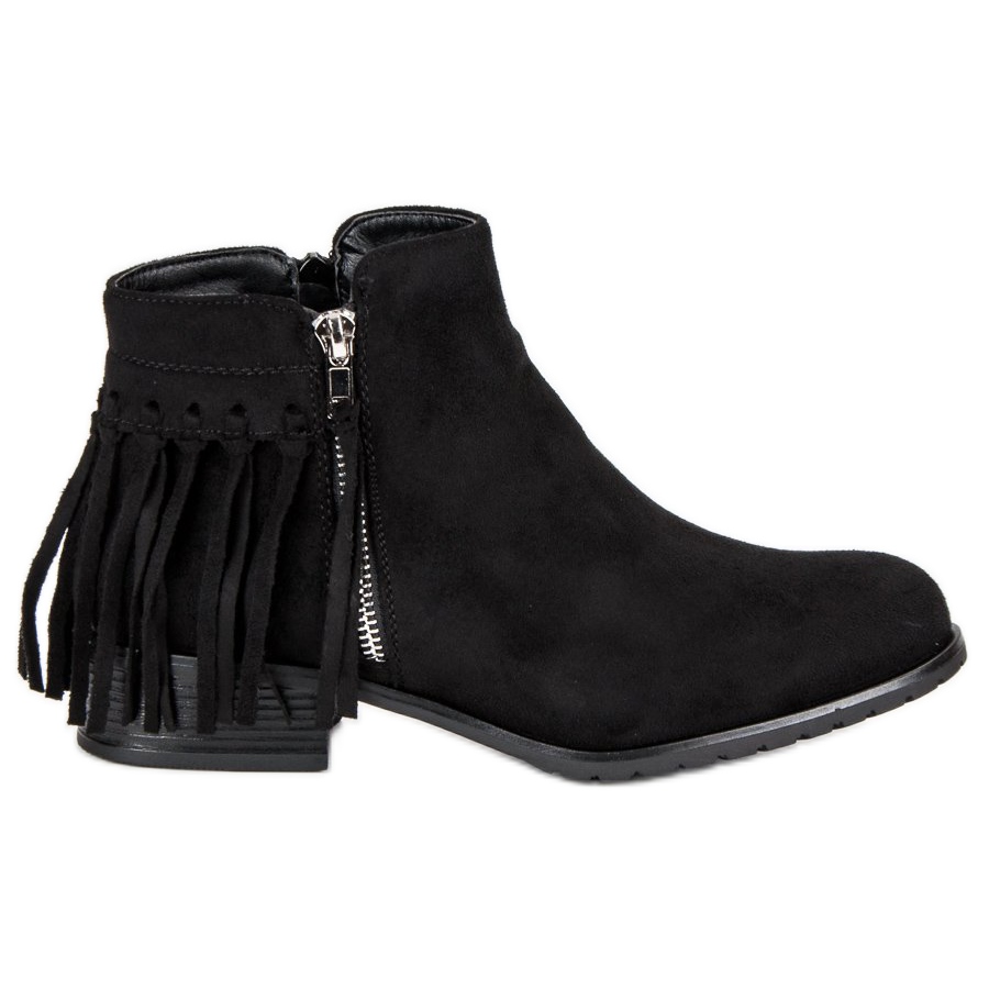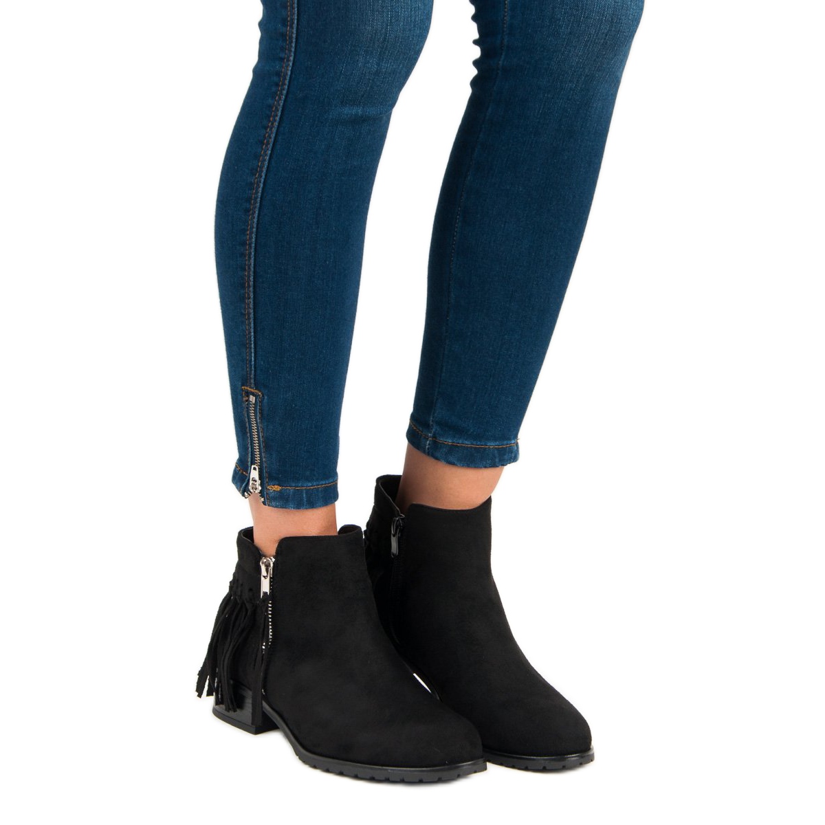Kayla gležnjače u boho stilu savršen su odabir za žene koje žele spojiti modu s udobnošću. Ove crne čizme od antilopa odlikuju se ne samo svojim elegantnim izgledom, već i pažljivom izradom od visokokvalitetnog ekološkog antilopa. Klasična prednja strana s okruglim vrhom i ukrasni detalji, poput srebrnog patentnog zatvarača i dugih resica straga, daju im jedinstven karakter.