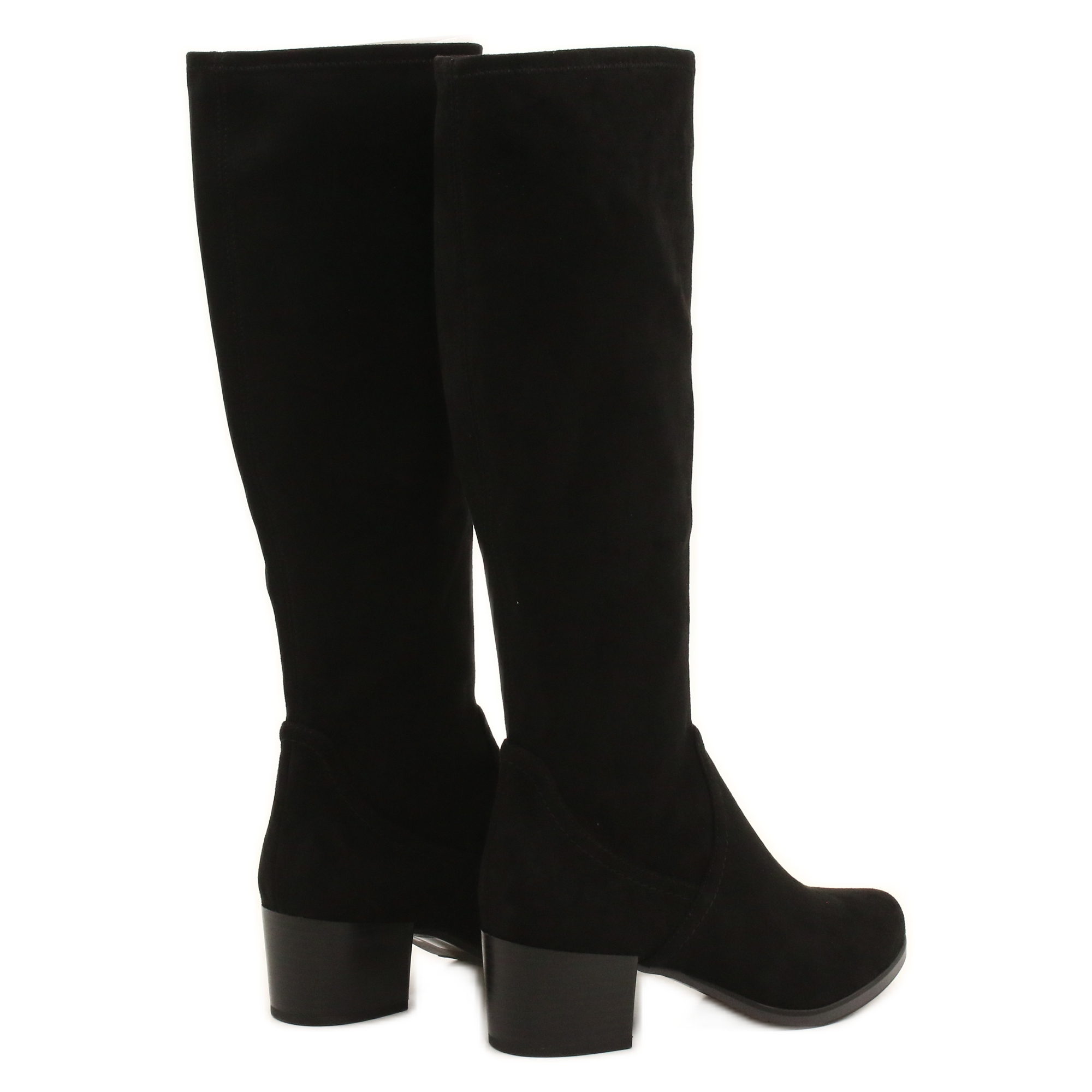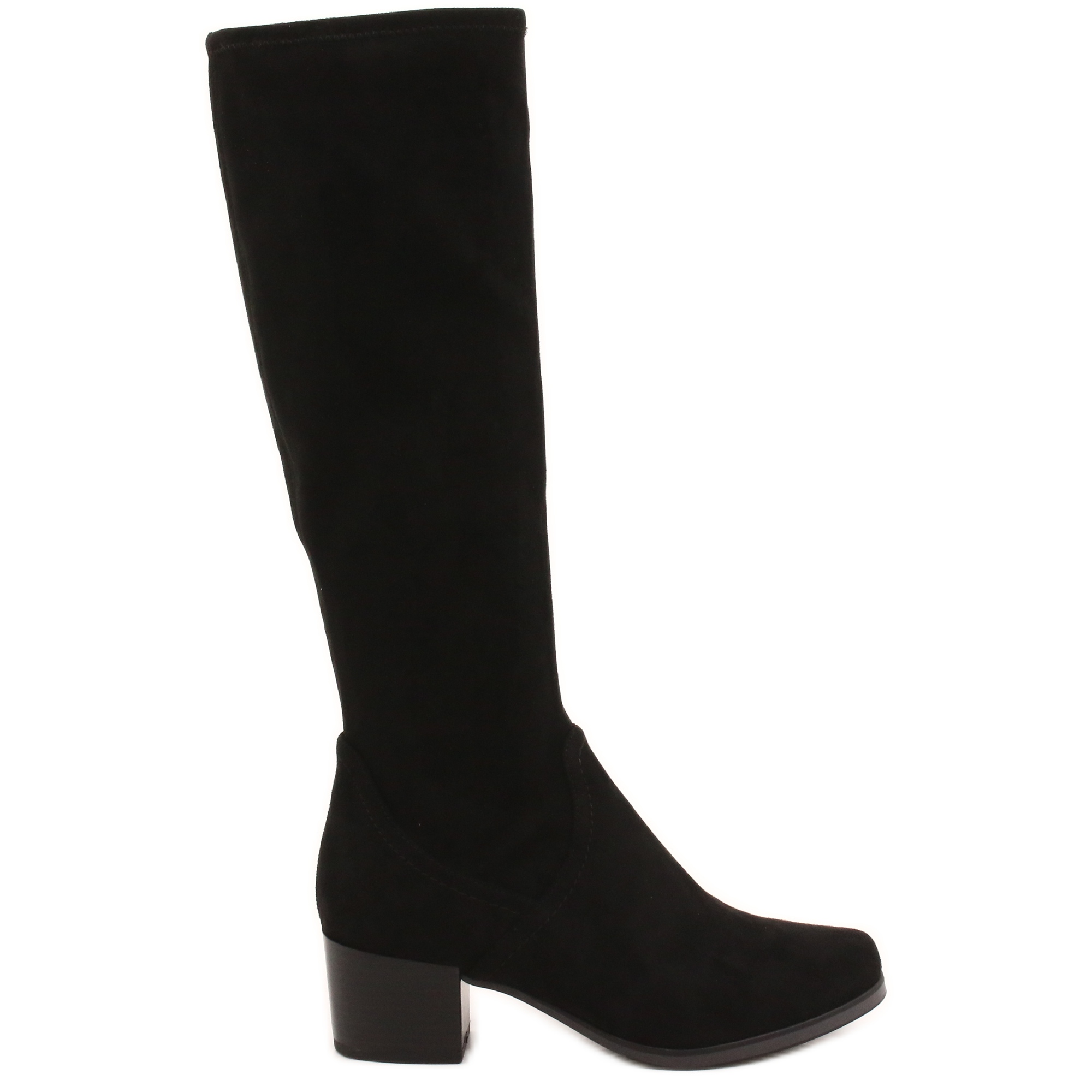 Duge, elegantne čizme od kaprice izrađene od guste, rastezljive tekstilne materijale (rastezanje) u univerzalnoj crnoj boji. Zahvaljujući elastičnoj tkanini, gornji dio se lijepo prilagođava teletu, osiguravajući moderan izgled i udobnost nošenja. PFI 100% veganski model - bez životinjskih komponenti.