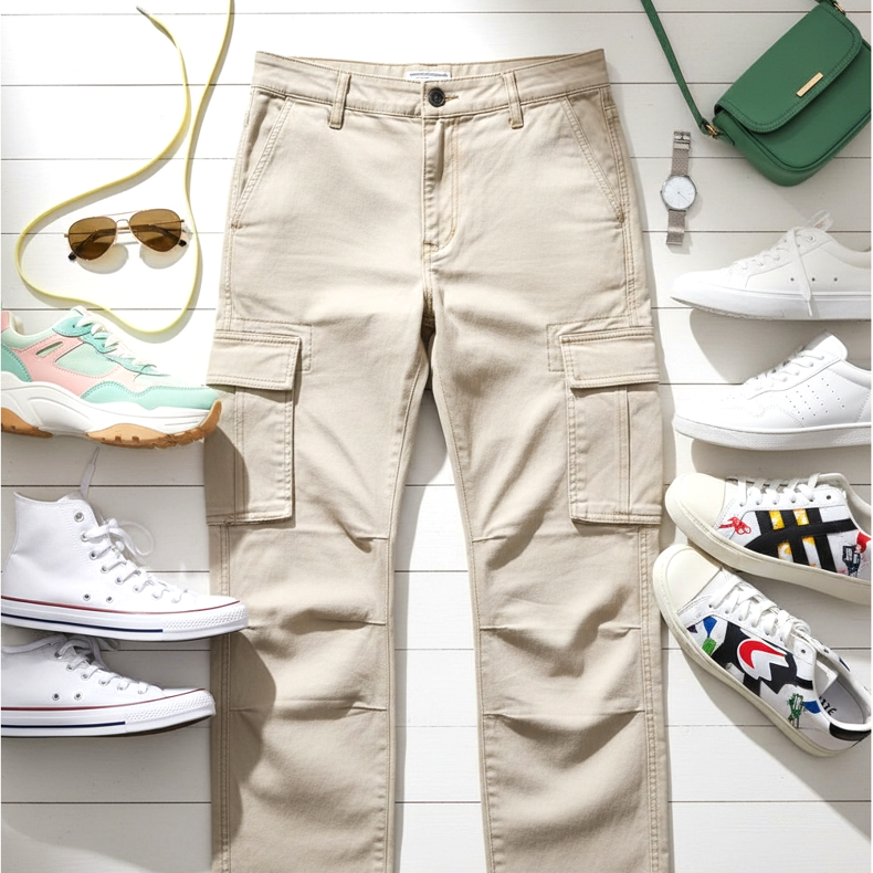 U toplijim danima, kada odaberete tanke cargo hlače, savršeno će pristajati tenisice, mokasine ili čak sandale. Ove cargo hlače su lagane, prozračne i pružit će udobnost čak i tijekom dugih šetnji. Možete odabrati i balerinke koje će vašem ljetnom stajlingu dodati dašak elegancije.
