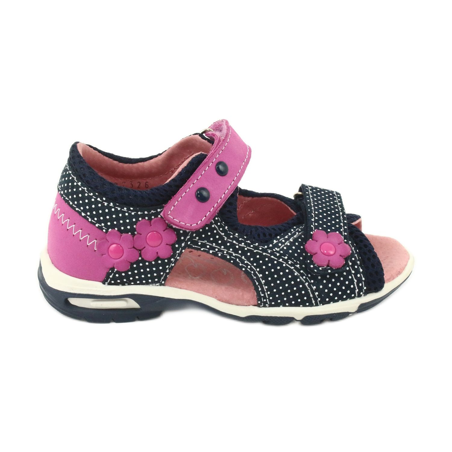 Ove šarmantne sandale dostupne su u dvije boje: mornarsko plavoj i ružičastoj, ukrašene malim bijelim točkicama i ukrasima u obliku ružičastih cvjetića. Zahvaljujući kopčanju na čičak, lako se prilagođavaju djetetovom stopalu, što povećava udobnost korištenja. Čvrsta potpetica pruža odgovarajuću stabilizaciju, a profilirani uložak savršeno pristaje sandalama anatomiji stopala.