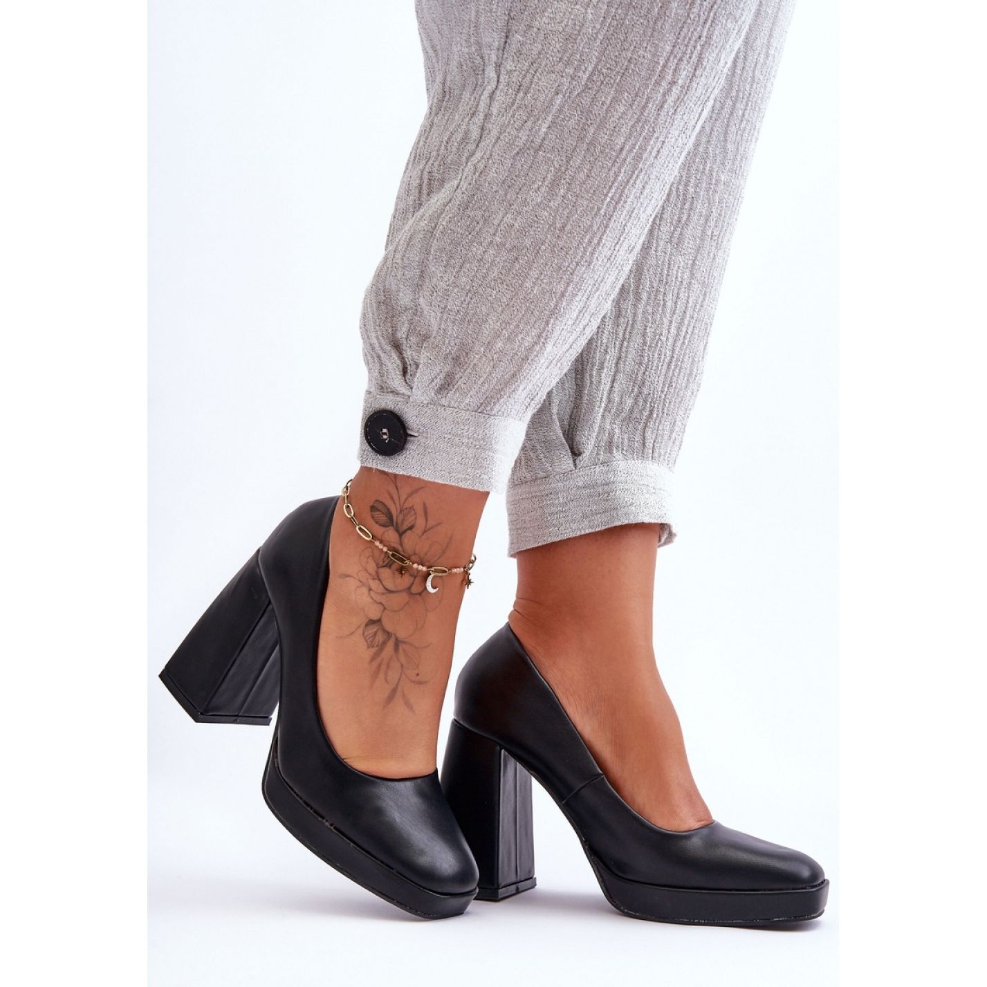 Stabilan, viši blok s visinom od 10,5 cm i osjetljivom platformom s visinom od 2 cm pružaju neusporedivu udobnost nošenja, što im čini sjajno rješenje i za rad i za razne rezultate, poput događaja ili važnih sastanaka. Modni kvadratni nos daje im moderan karakter, a ukočena peta čini ih savršeno prilagođenim stopalu.