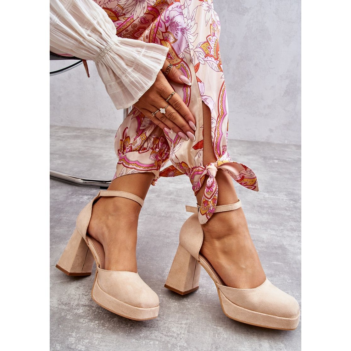 Cipele karakterizira podesivi remen koji se kopča kopčom, što omogućuje savršeno pristajanje uz nogu. Masivna potpetica snažno ističe figuru, a njena visina od 9 cm čini cipele elegantnim i stabilnim. Dodatno, korištena platforma visoka 2 cm povećava udobnost nošenja, tako da ni dugi sati provedeni u njima neće biti problem.