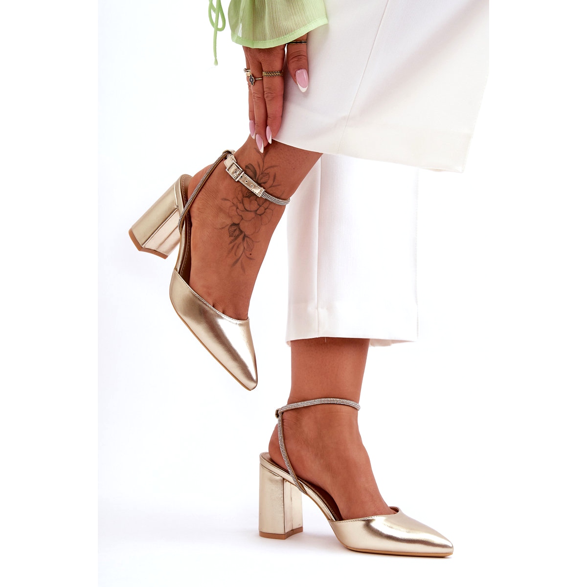 Elegantne Lyros pumpa u metalnoj nijansi zlata - kombinacija stila i udobnosti. Napravljena od eko kože, montirana na stabilnu petu u obliku posta (visina 8,5 cm), s karakterističnim nosom u Spitzu. Suptilni remen ukrašen rhinestones koji oponašaju rinestone i pričvršćivanje kopča dodaju eleganciju i jedinstveni sjaj modelu. Mekani umetak eko kože osigurava utjehu čak i tijekom duljeg nošenja.