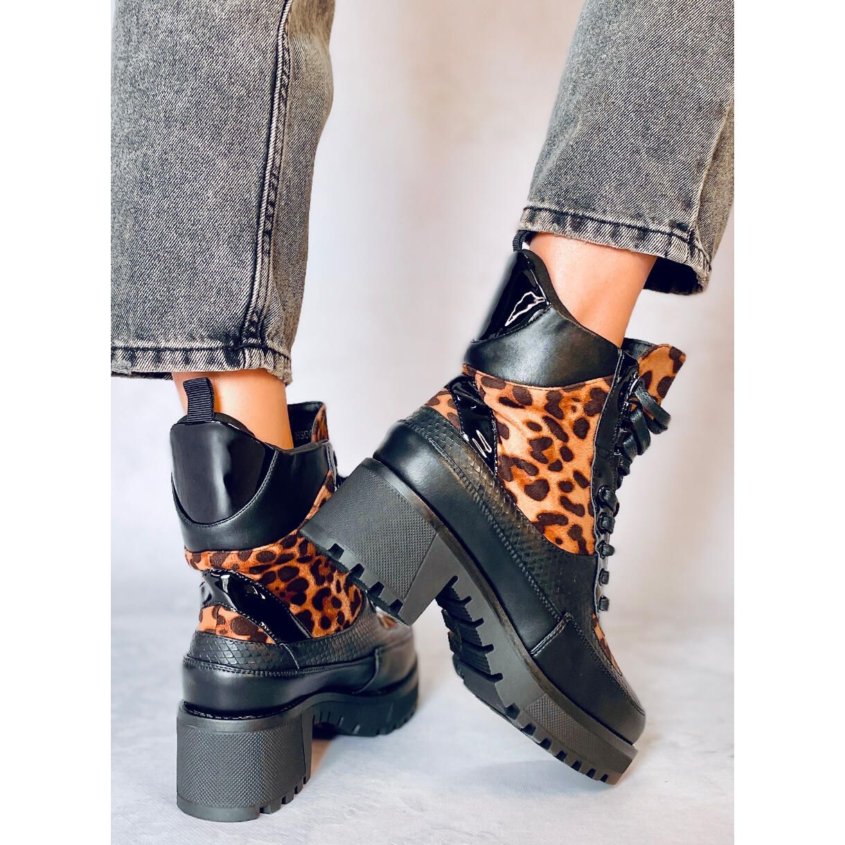 Otkrijte jedinstven stil i udobnost zahvaljujući ženskim čizmama s visokim potplatom NS067 u modernom motivu leoparda. Ove crne gležnjače na vezanje savršen su izbor za žene koje se žele izdvojiti iz mase i pratiti najnovije modne trendove.