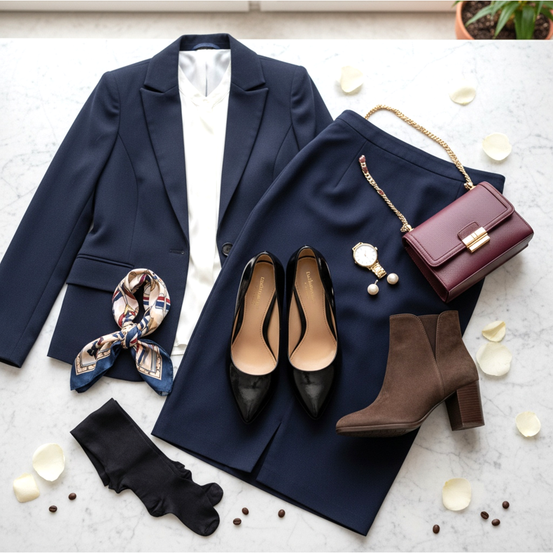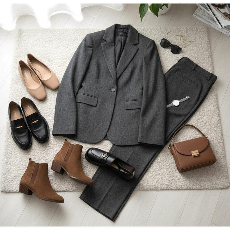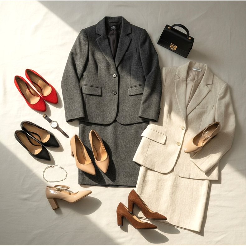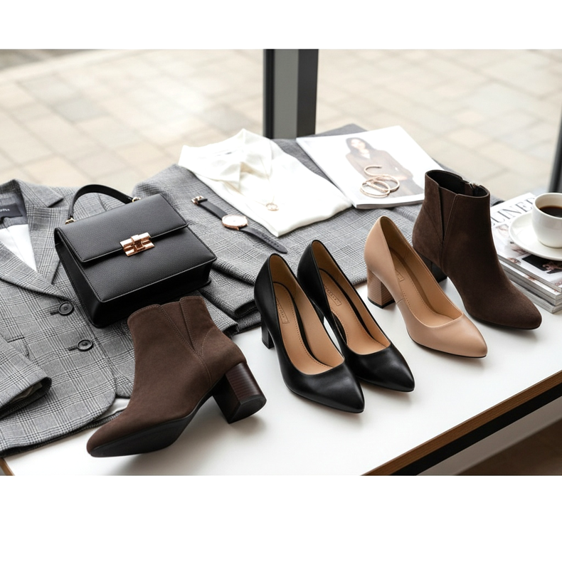 Savršeno rješenje bit će cipele s blok petom ili stiletto petom. Birajte modele u prigušenim bojama – crnoj, bež ili smeđoj. Imajte na umu da je odijelo klasična odjeća, pa će visoke pete pomoći u održavanju pravih proporcija vaše figure i učiniti da cijeli stajling izgleda skladno i profesionalno.