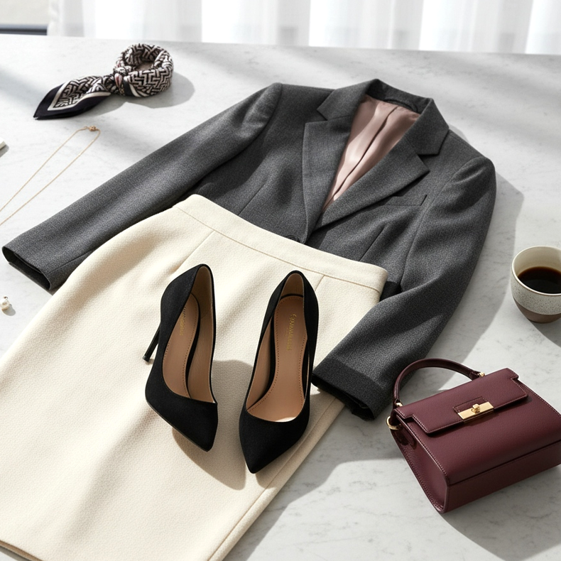 Odijelo je odličan izbor za ured, sve dok ga stilizirate na odgovarajući način. Elegantne cipele na visoku petu najbolje su za posao jer će optički izdužiti noge i dodati gracioznost vašoj silueti.