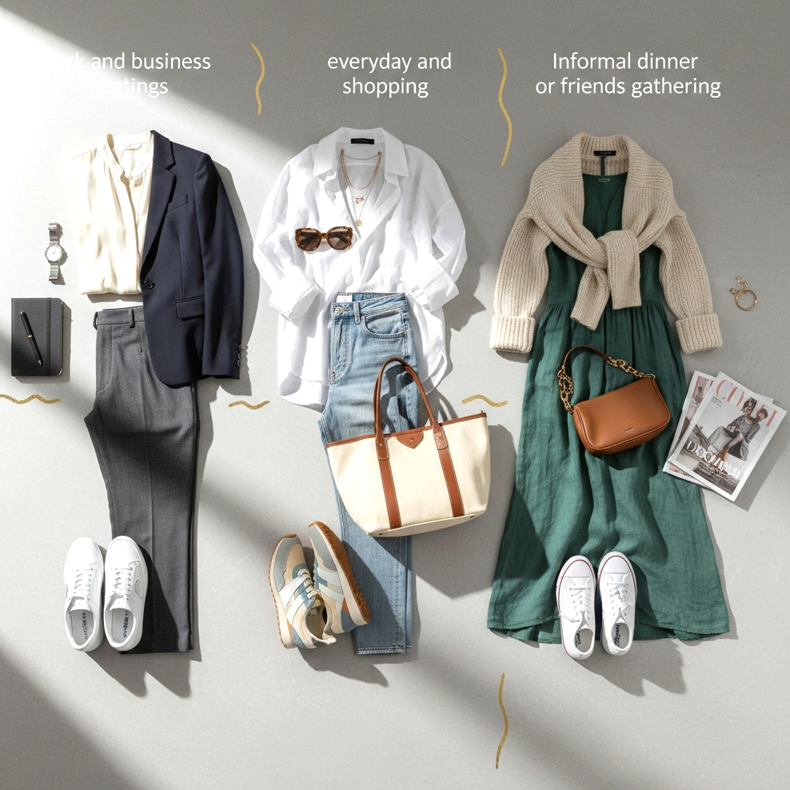 Za rad i poslovne sastanke: Bijele uske tenisice savršeno pristaju uz pripijene hlače u tonovima sive ili tamnoplave. Za gornji dio odaberite svilenkastu bluzu ili minimalistički sako. Ovaj stil je i profesionalan i svježeg izgleda - savršen za ležeran petak u uredu ili sastanak s klijentom u kreativnoj industriji.