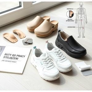 Mnogi zaposlenici hvale preventivnu i medicinsku obuću, npr. klompe ili Birkenstock japanke. Njihov oblikovani uložak podupire svod stopala i osigurava pravilno držanje. Ipak, ne zaboravite da takve cipele trebaju imati remenčić koji drži petu – lupanje cipelom pri svakom koraku nepotrebno umara mišiće.