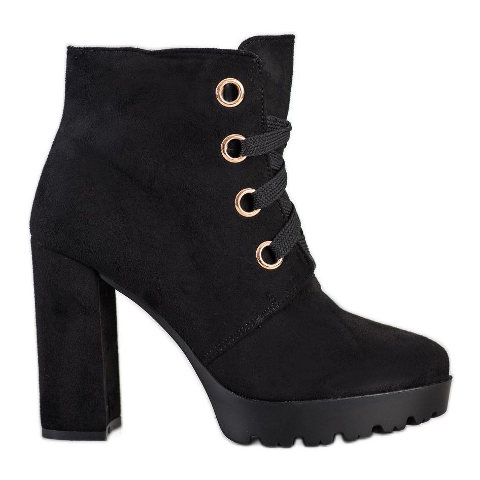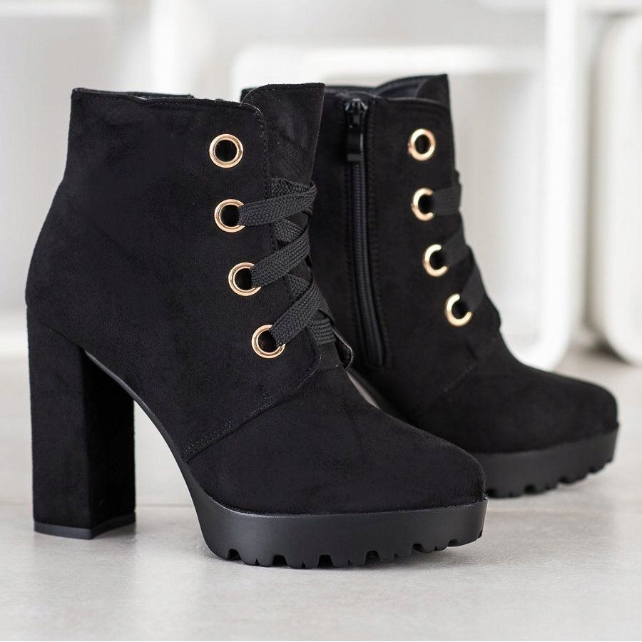 Ovdje su jedinstvene gležnjače na vezanje na visoku petu proizvođača Juliet koje će se savršeno uklopiti u Vaš ormar! Ove crne gležnjače savršen su spoj ležernog i elegantnog stila, što ih čini savršenim izborom za mnoge prilike - od svakodnevnih šetnji do večernjih zabava.