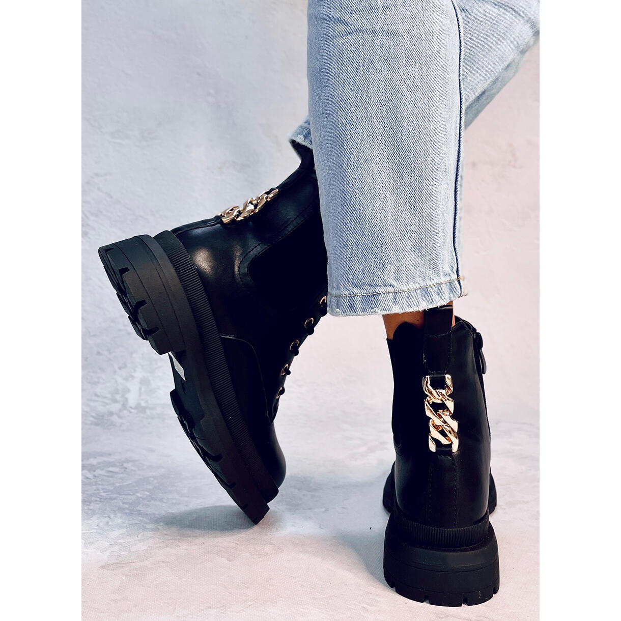 Elegantne i istodobno praktične ženske čizme izrađene od ekološke kože zrna. Model se razlikuje modnim zlatnim lancem smještenim na stražnjem dijelu gornjeg dijela, koji se dobro suprotstavlja Universal Black -u. Klasično vezanje omogućuje vam da savršeno uskladite cipelu s dionicama stopala, a bočna brava olakšava brzo umetanje i skidanje. Unutrašnjost obložena osjetljivim krznom pruža udobnost i zagrijavanje u hladnijim danima.
