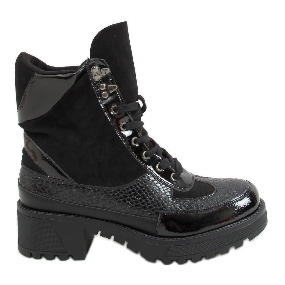 Ovo su čizme koje morate imati u svojoj kolekciji! Model KL-757 Black ženske su radničke čizme na vezanje, koje se odlikuju ne samo originalnim krojem, već i modernim umetcima u obliku lakiranih akcenta i motiva zmijske kože. Zahvaljujući njima, svaki će stajling dobiti karakter, a vi ćete sigurno privući pažnju okoline.
