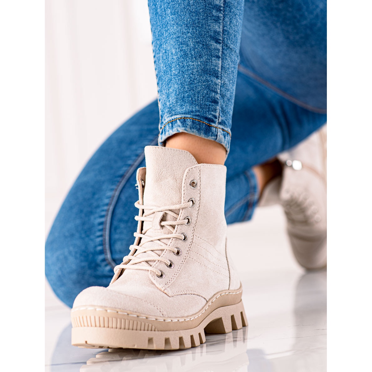 Otkrijte udobnost i stil uz bež gležnjače iz S. BARSKA! Ove gležnjače na vezanje savršena su obuća za svaki dan, savršene za jesen i zimu. Izrađene od visokokvalitetne imitacije antilop kože, pružaju elegantan izgled i udobnost nošenja.