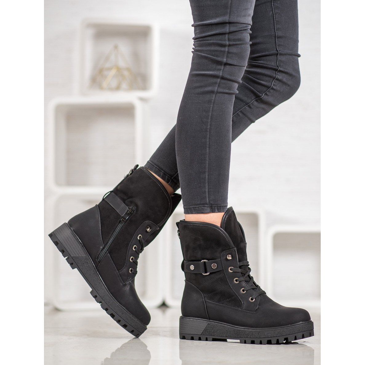 Otkrijte eleganciju i udobnost uz SHELOVET čizme na vezanje uz bundu od ovčje kože u crnoj boji. Ove elegantne ženske cipele postaju ne samo moderan element vašeg ormara, već i idealan izbor za hladnije dane zahvaljujući svojoj izoliranoj unutrašnjosti. Izrađene od visokokvalitetne ekološke kože, nude izvrsnu izdržljivost i udobnost nošenja.