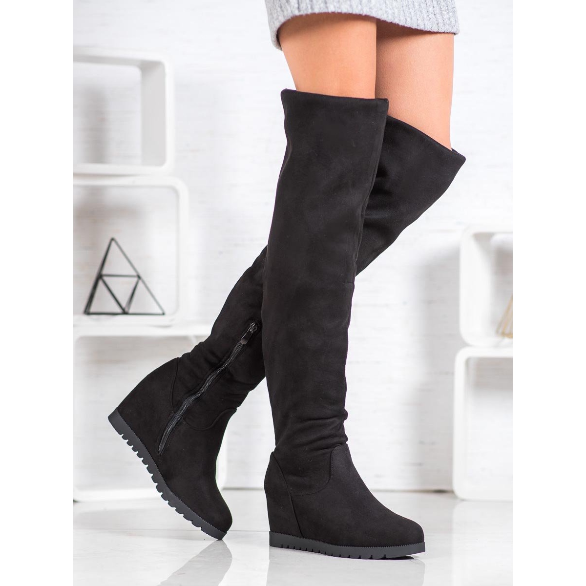 Otkrijte eleganciju i udobnost uz SHELOVET čizme na klin od brušene kože. Ove jedinstvene cipele, izrađene od ekološke kože s završnim slojem antilopa, dizajnirane su za žene koje cijene stil i udobnost. Gornjište iznad koljena u univerzalnoj crnoj boji čini ove čizme savršenim za različite stilove - od ležernih do svečanijih.