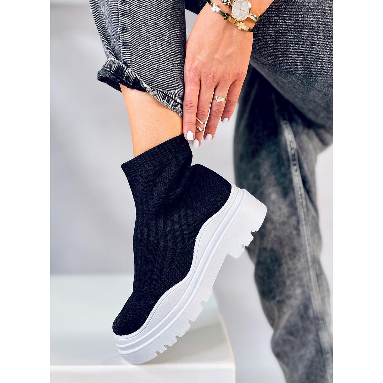 Predstavljamo elegantne BM čizme s fleksibilnim crnim gornjištem koje spajaju stil i udobnost. Ove iznimno moderne čizme izrađene od tkanine u obliku čarape savršeno prianjaju uz nogu, osiguravajući udobnost nošenja tijekom cijelog dana.